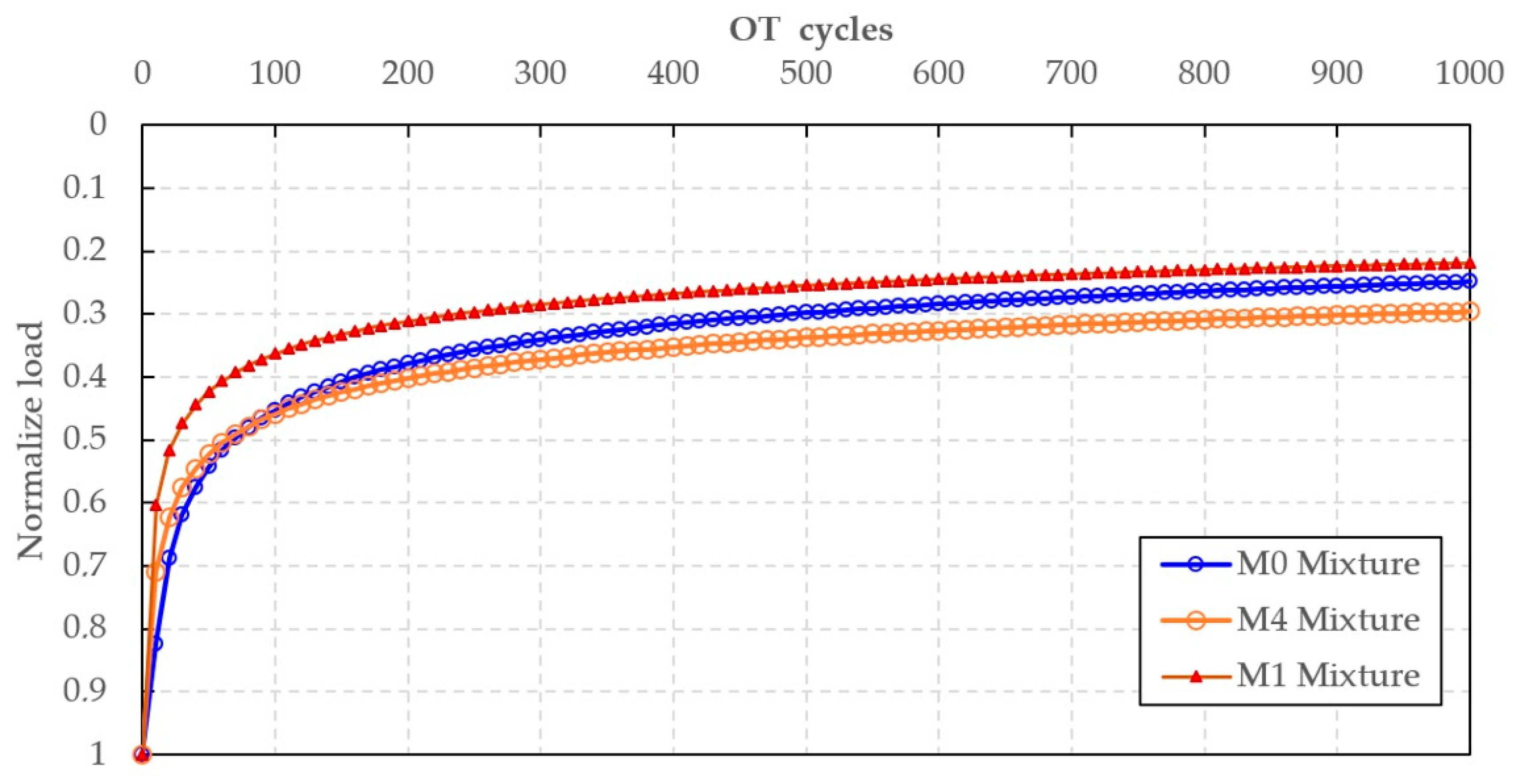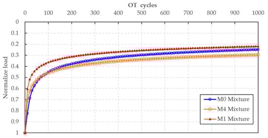 Cracking resistance was markedly enhanced through the combined effects of REOW rejuvenation and SBS polymer reinforcement. The SCB fracture energy increased from 1062 J/m2 for the control mixture (M0) to 1320 J/m2 with REOW modification alone (M1) and further to 1382 J/m2 for the REOW–SBS hybrid mixture (M4), corresponding to improvements of approximately 24% and 30%, respectively, relative to the control. Overlay Test results showed a higher residual load at 1000 cycles (≈0.30–0.32 for M4 versus ≈0.25 for M0), confirming the superior resistance of the hybrid mixture to fatigue-induced cracking.