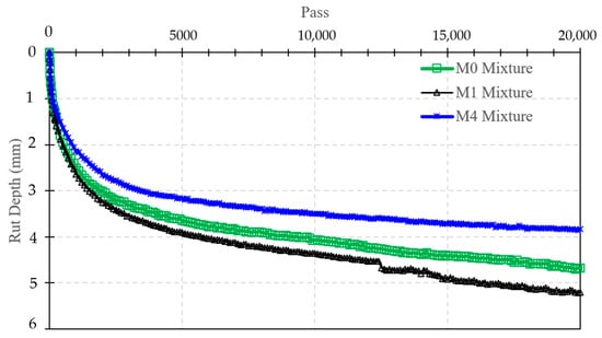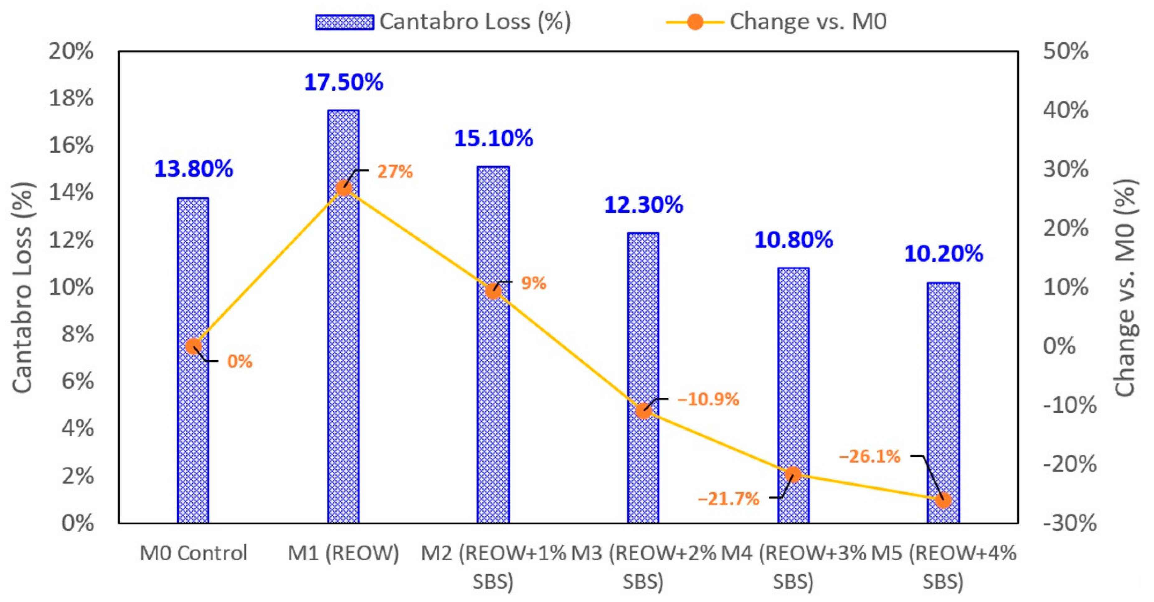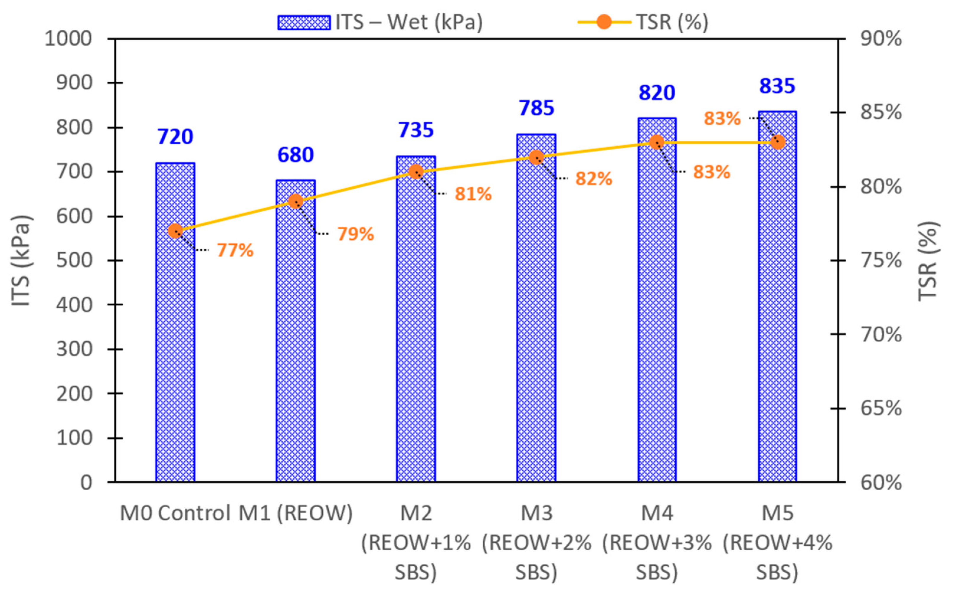 Mixture performance results demonstrate clear benefits of the REOW–SBS hybrid system. At the mixture scale, the hybrid mixture (M4) achieved a wet ITS of 820 kPa and a TSR of 83%, exceeding the commonly adopted 80% moisture resistance criterion, whereas the control mixture remained below this threshold (77%). Cantabro loss was reduced from 13.8% (M0) to 10.8% (M4), indicating improved resistance to raveling. Hamburg wheel tracking results showed that rut depth at 20,000 cycles decreased from 4.4 mm (M0) and 4.9 mm (M1) to 3.9 mm for M4, corresponding to an approximately 12–20% reduction in permanent deformation.