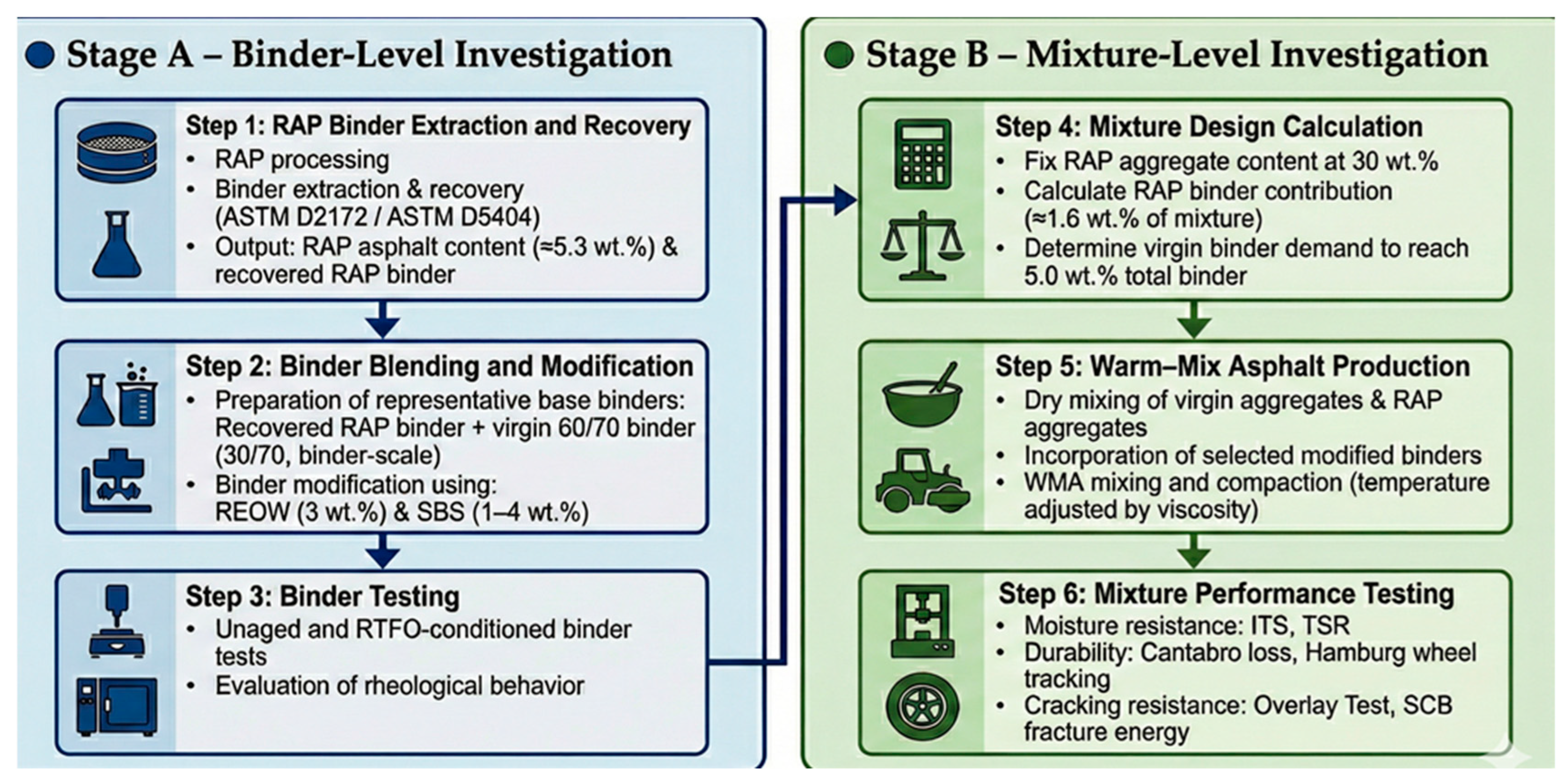 Experimental workflow for RAP-containing warm-mix asphalt.