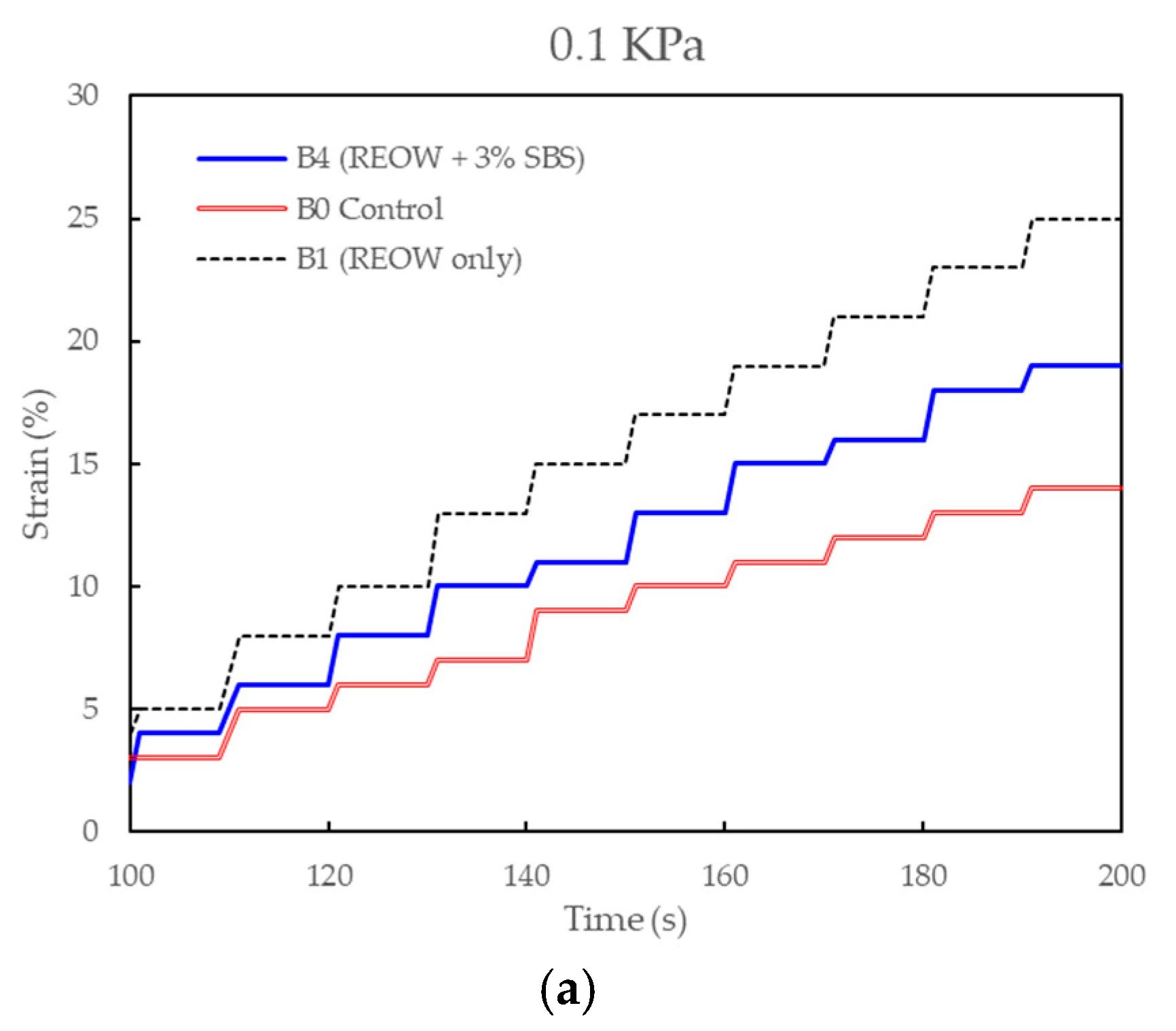 For REOW-modified binders (B1 and B4), the rejuvenator was added at 135–140 °C and mixed for 20 min at 500–700 rpm to promote effective diffusion into the aged RAP binder. For SBS-modified binders (B4), SBS pellets were subsequently introduced at 175–180 °C and mixed under high shear (3000–4000 rpm) for 60 min to ensure complete polymer swelling and network formation. After modification, SBS-containing binders were conditioned for an additional 30 min at 160 °C to stabilize the polymer structure.