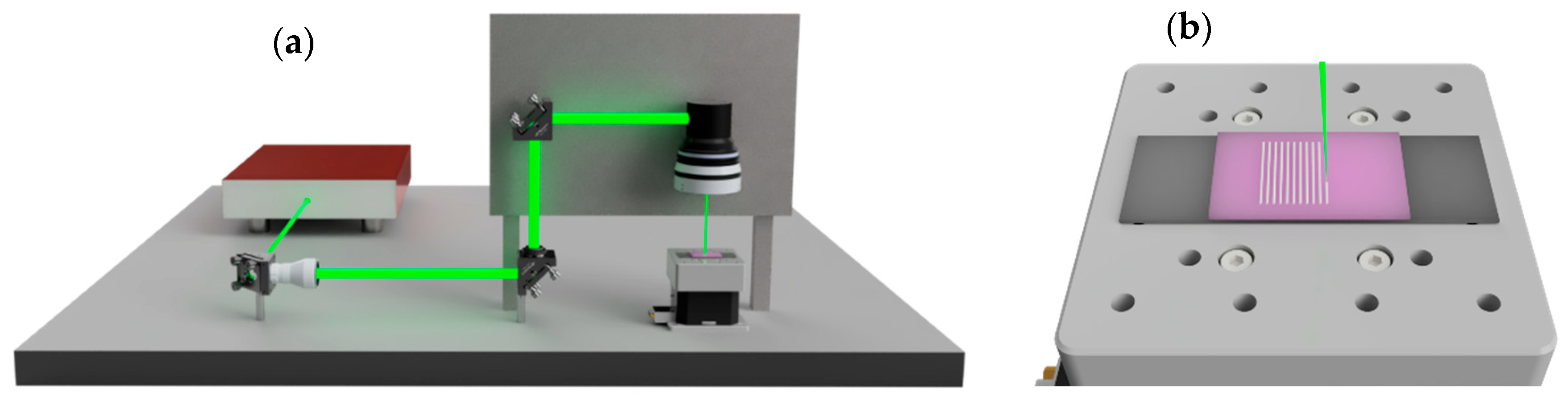 The dried photopolymer layers were subsequently processed using the femtosecond laser system by writing the diffraction gratings at the material surface. After laser exposure, the samples were bleached under ambient light for 48 h to remove the residual dye.