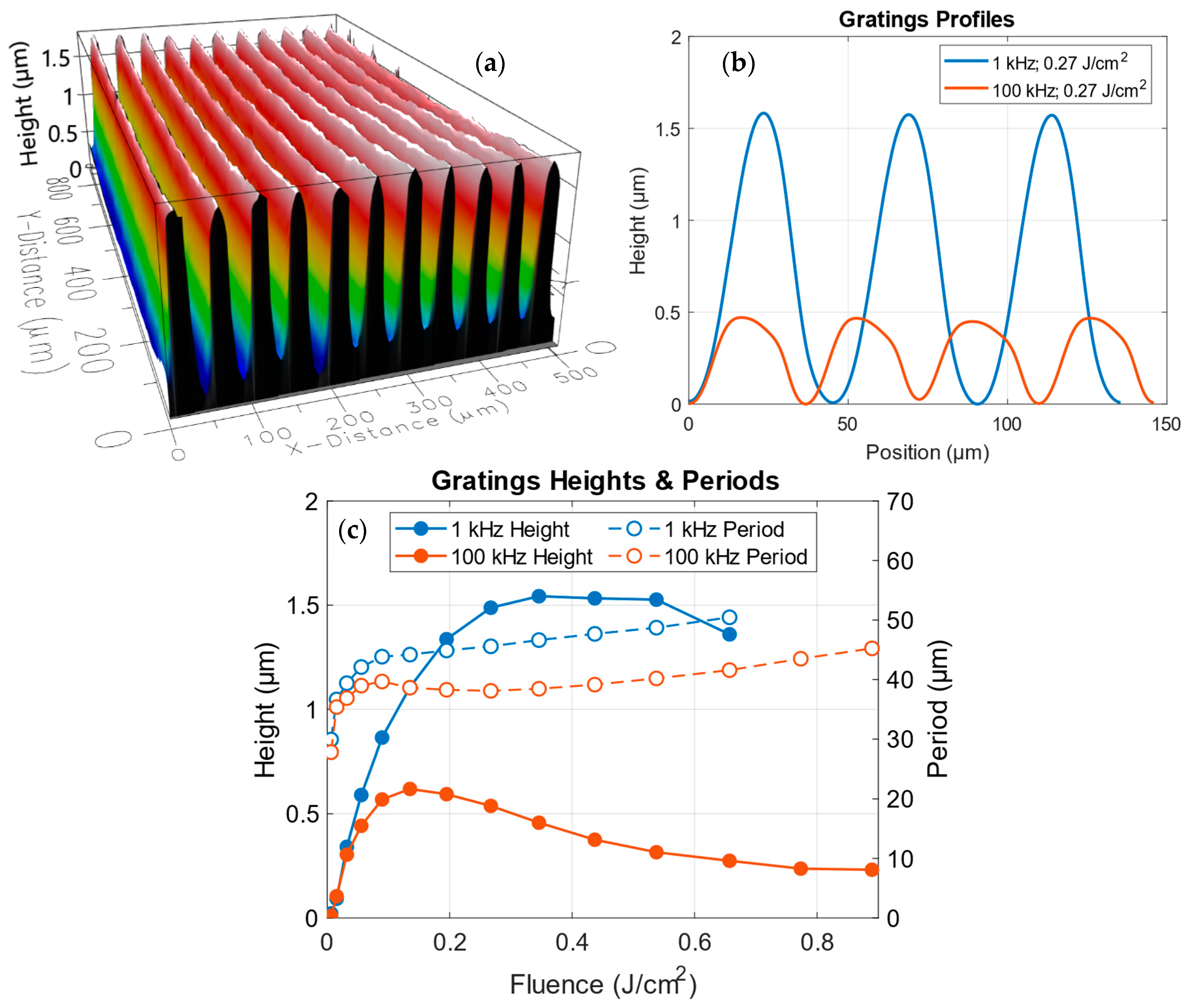 Figure 3a presents a 3D profilometric image of a grating (R = 1 kHz, F = 0.27 J/cm