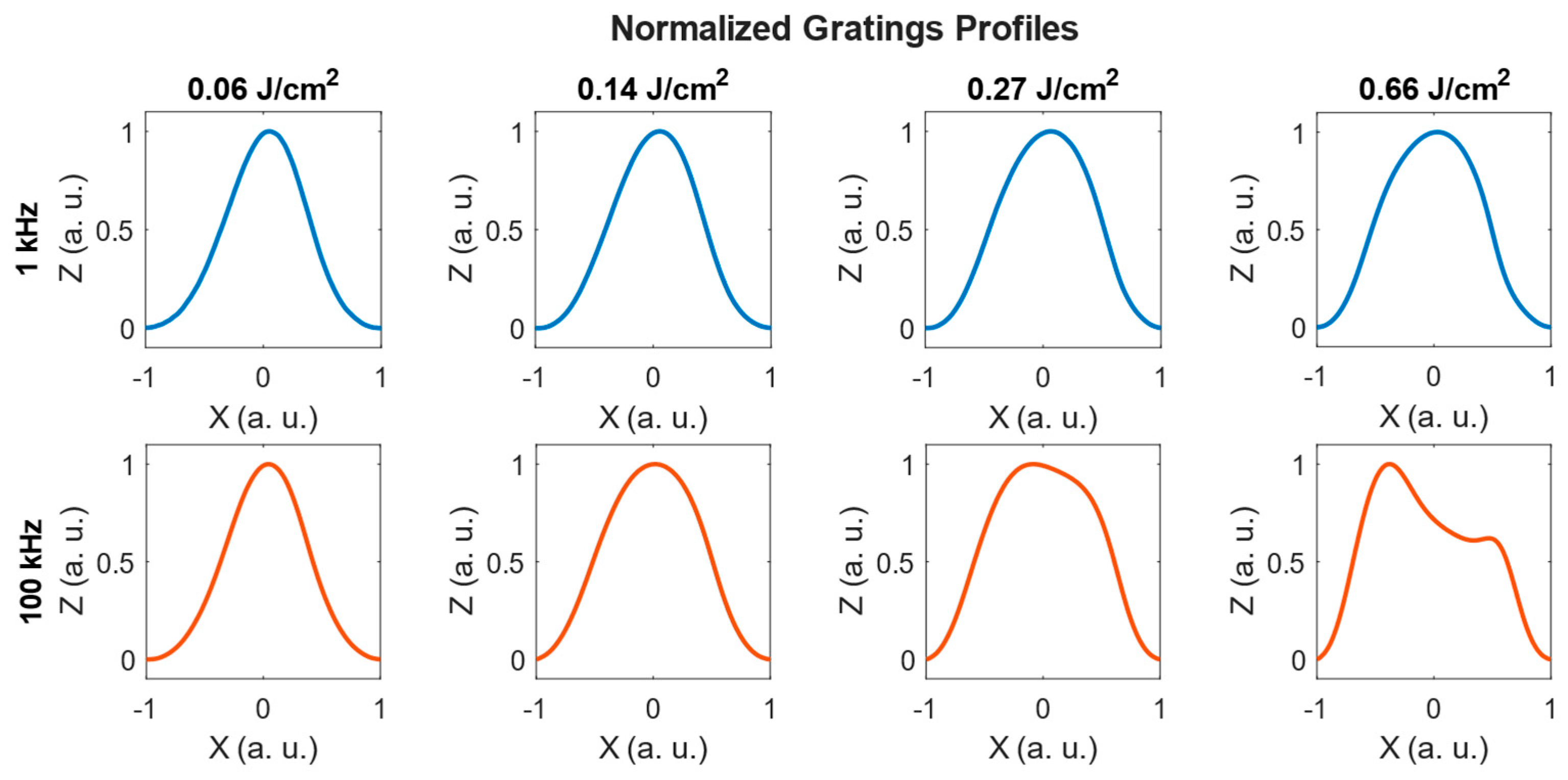 Figure 4 compares the normalized profiles for several fluences at 1 kHz and 100 kHz. The heights have been normalized in arbitrary units between 0 and 1 for a better comparison of the shapes.