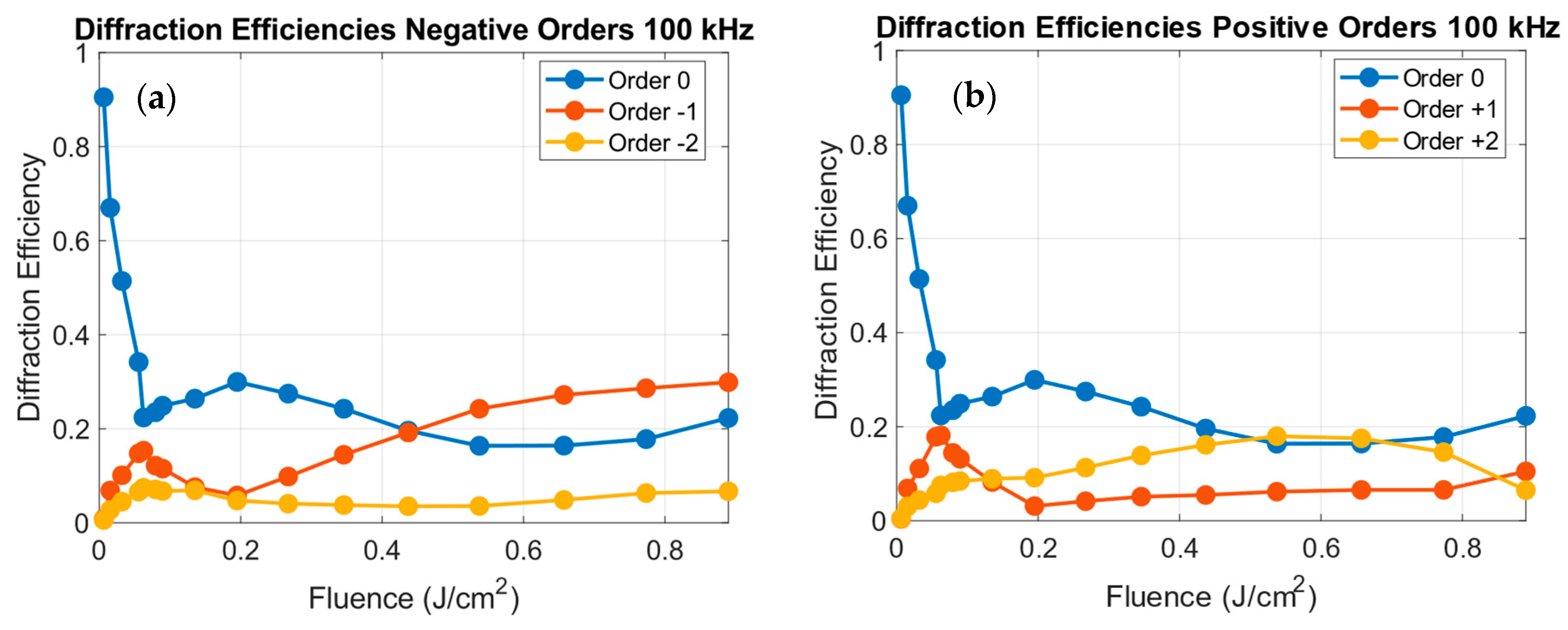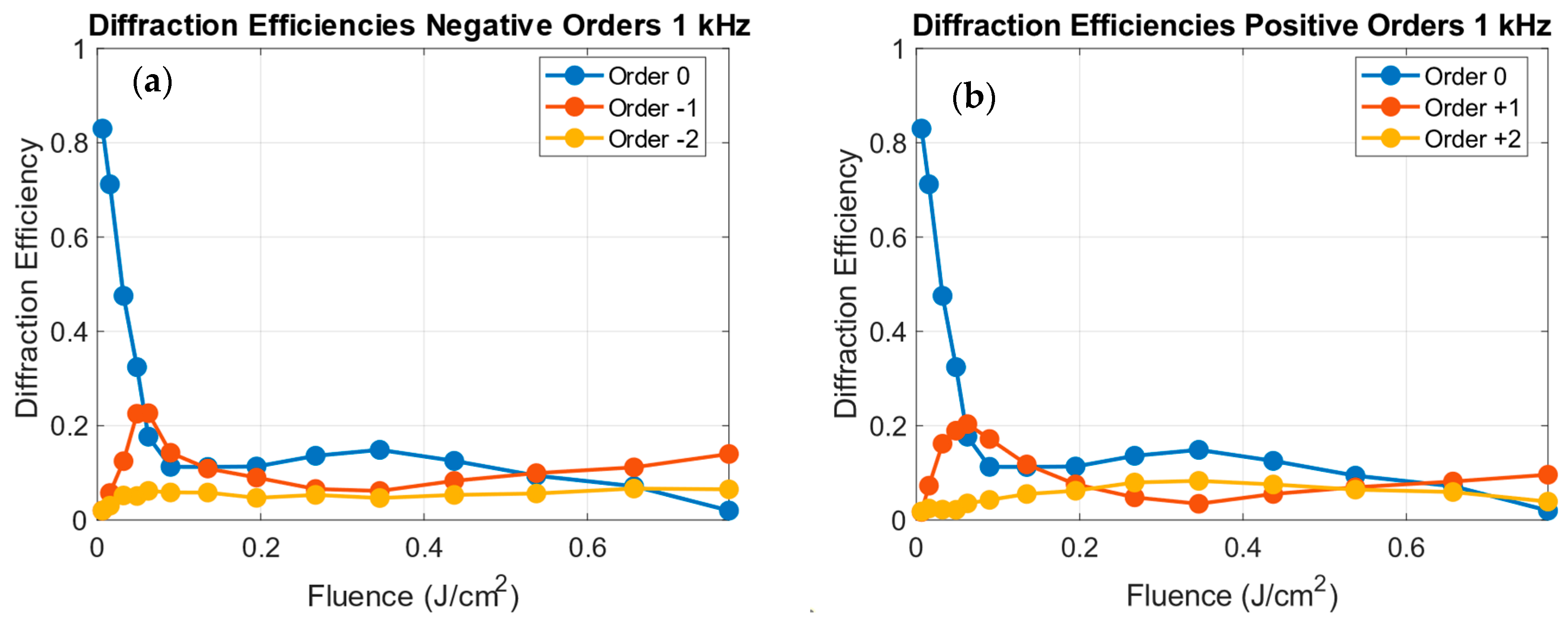 Figure 5, at 1 kHz the ±1 and ±2 orders exhibit the expected symmetric behavior. Initially, as fluence increases, the diffraction efficiency of the ±1 orders rise to a maximum and then gradually decreases and stabilizes for fluences greater than 0.15 J/cm
