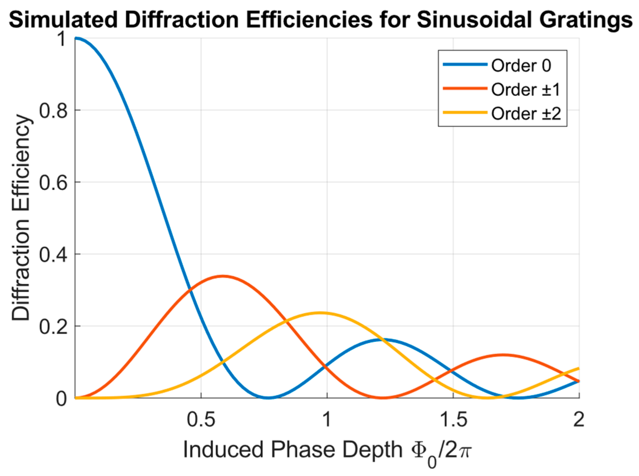 , calculated for the 0, ±1 and ±2 orders. The curves were obtained from the Fourier decomposition of a sinusoidal phase profile.