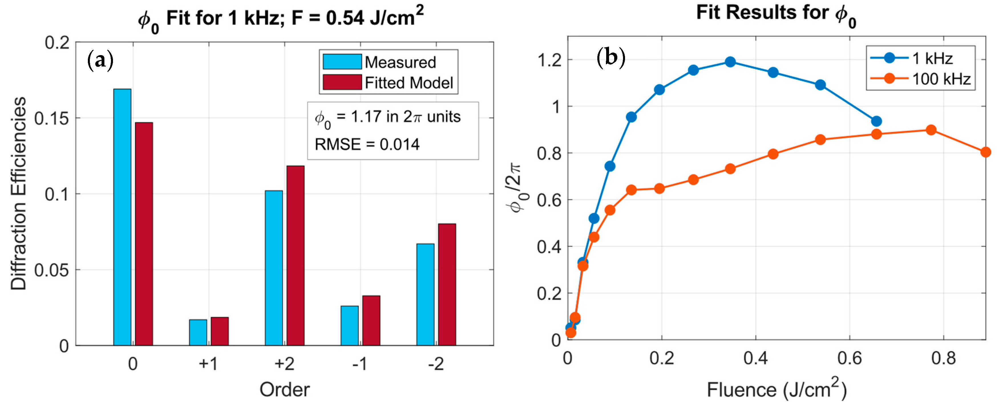 Figure 8a shows an example of the fitted and experimental efficiencies for a 1 kHz grating at 0.54 J/cm