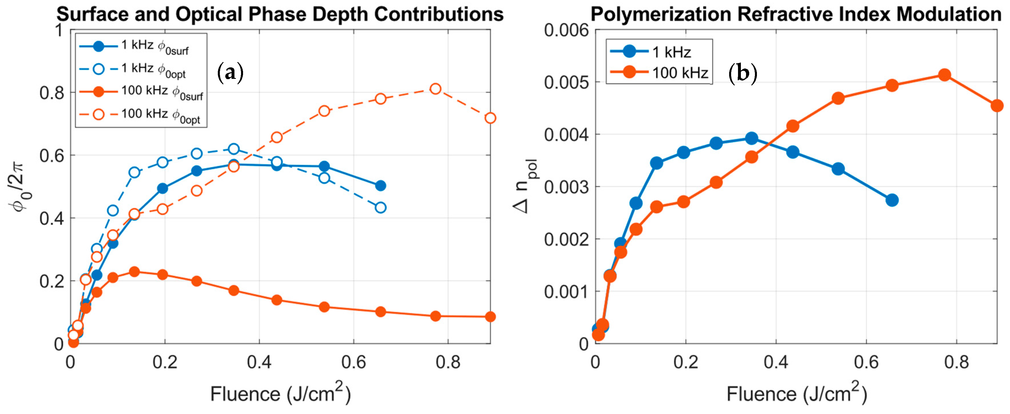 At 1 kHz, the surface contribution (blue points, solid lines) and the optical modulation (blue circles, dashed lines) are comparable for all the fluence range, indicating that both relief and internal index modulation coexist in the non-cumulative regime. At 100 kHz, however, the surface contribution (orange points, solid lines) is significantly suppressed, while the optical contribution (orange circles, dashed lines) becomes dominant and increases with fluence. This behavior confirms that processing in the cumulative regime favors bulk refractive index modulations, while at low repetition rates, the material response remains largely confined to the surface.