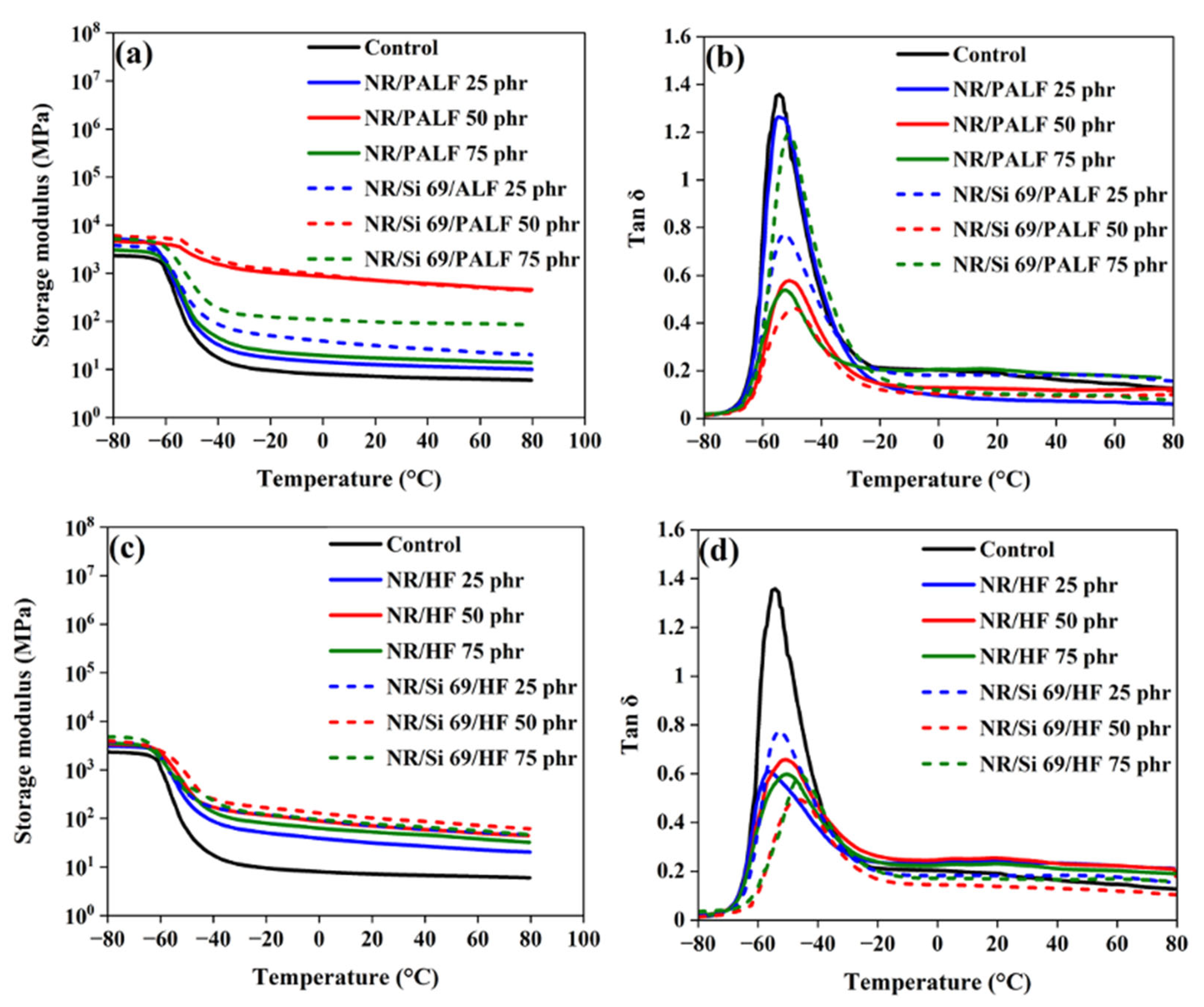 - Surajarusarn, B.; Hajjar-Garreau, S.; Schrodj, G.; Mougin, K.; Amornsakchai, T. Comparative study of pineapple leaf microfiber and aramid fiber reinforced natural rubbers using dynamic mechanical analysis. Polym. Test. 2020, 82, 106289. [Google Scholar] [CrossRef]