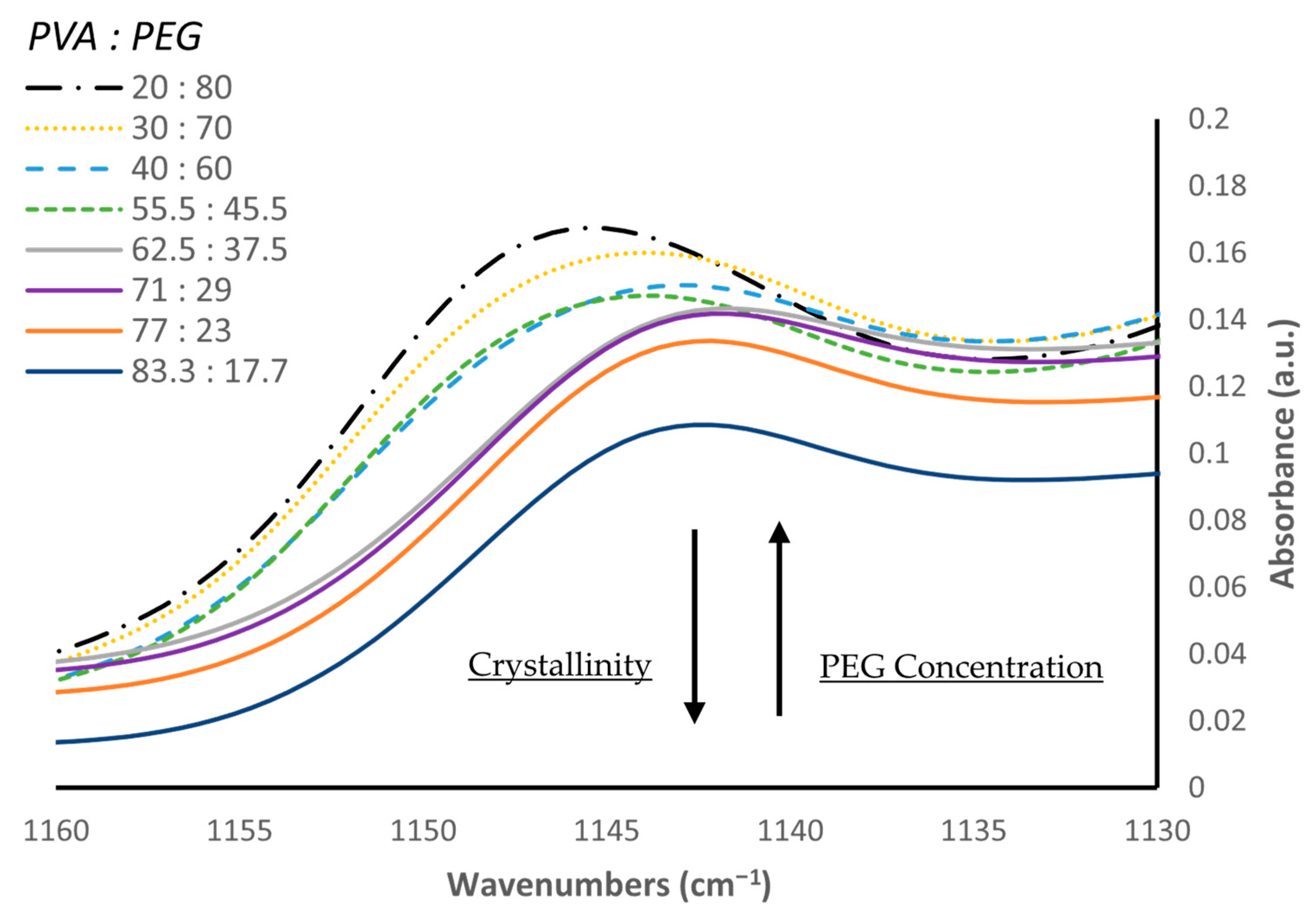 - Falqi, F.H.; Bin-Dahman, O.A.; Hussain, M.; Al-Harthi, M.A. Preparation of miscible PVA/PEG blends and effect of graphene concentration on thermal, crystallization, morphological, and mechanical properties of PVA/PEG (10 wt%) blend. Int. J. Polym. Sci. 2018, 2018, 8527693. [Google Scholar] [CrossRef]