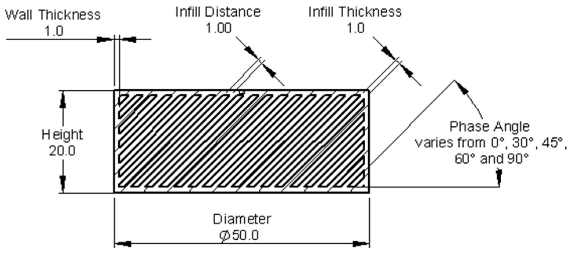 | Material | Infill Density | Infill Phase Angle | Theoretical Volume with Airgap, cm3 | Theoretical Volume of Infill, cm3 | Theoretical Mass, g | Theoretical Density, g/cm3 |