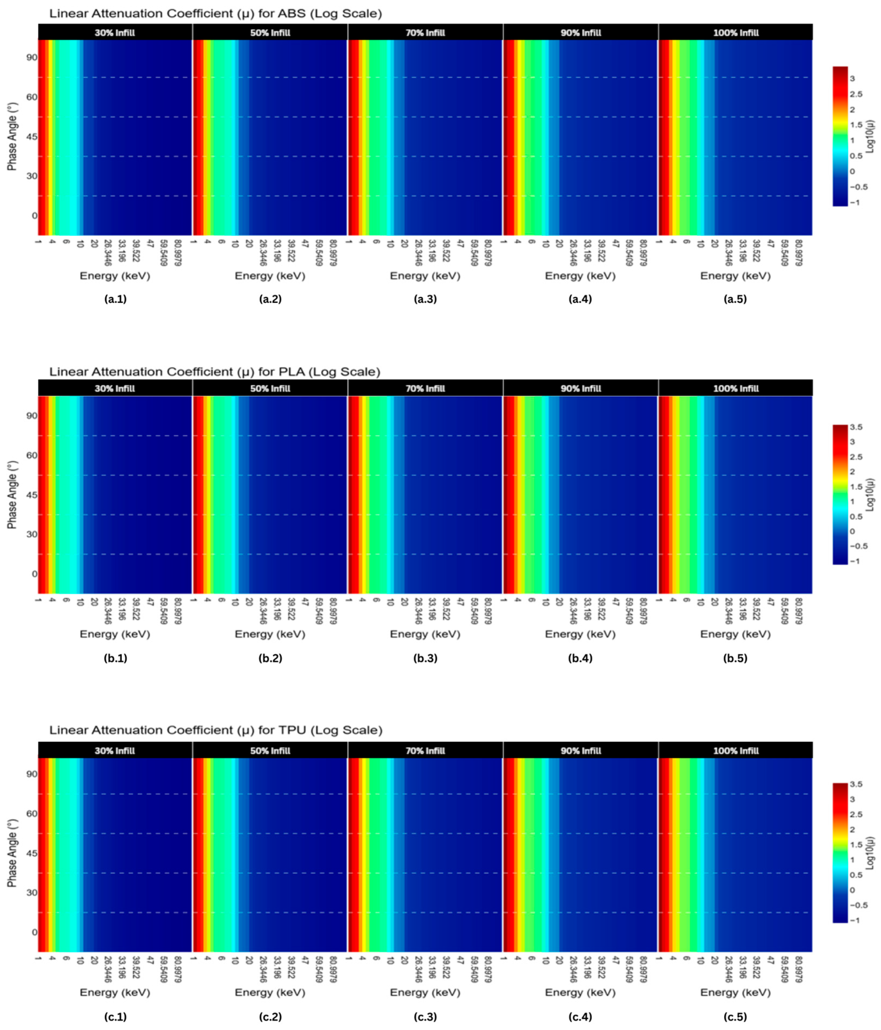 Lopez TB, Cabalhug JH, Arriola E, Afable ML, Lorenzo RJW, Fronda GB, Mecarandayo P, Santos GN, Advincula R, Astronomo A, et al. Radiation Attenuation Calculation of 3D-Printed Polymers Across Variable Infill Densities and Phase Angles for Nuclear Medicine Applications. Polymers. 2026; 18(1):49. https://doi.org/10.3390/polym18010049