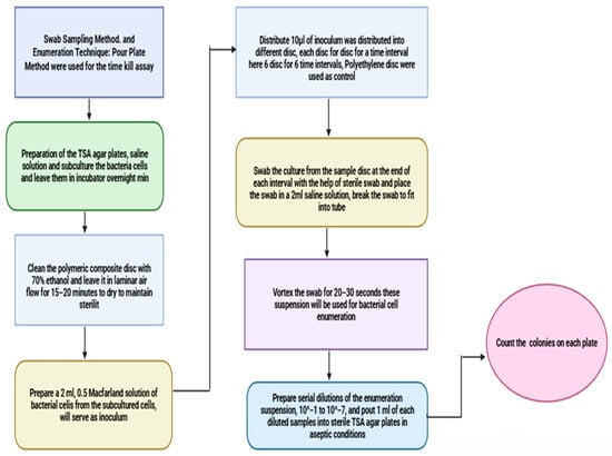 Protocol: The Swab Sampling Method (CMMEF Chapter 3) [62] and Enumeration Technique (Pour Plate Method, APHA 9215 B, BAM Jan 2001, Chapter 3) [63] were used for the time kill assay. To measure the bacteria’s antimicrobial activity, the agar plate diffusion technique, as outlined in protocol CCFRA 1.1.4.2003, was used [64]. The entire setup and set of procedures were developed by our team, following microbiology norms and ISO 22196 [55]. For the antimicrobial properties, samples of bacteria with certified standards were tested and subsequently stored in the lab as a quality control measure. Figure 2 depicts a flowchart of the methodology of the time kill assay.