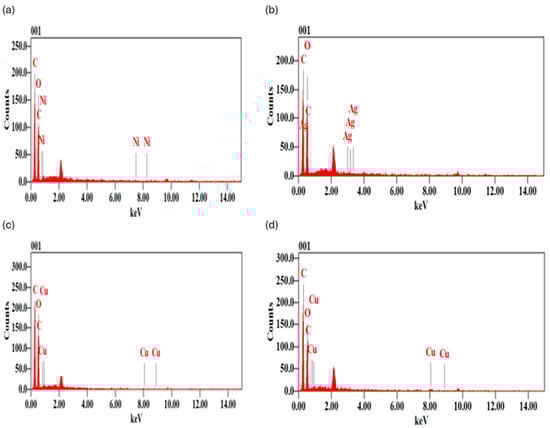 (a) EDS of Ni+PLA; (b) EDS of Ag+PLA; (c) EDS of Cu+PLA; and (d) EDS of CuO+PLA.