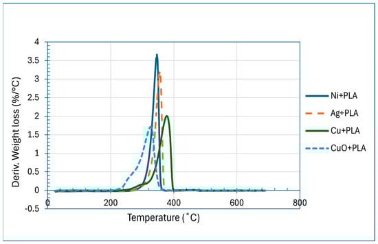 Thermogravimetric analysis (TGA) was used to determine the thermal stability of PLA nanocomposites that were reinforced using Cu, Ag, Ni, and CuO nanoparticles. According to the TGA curves (Figure 5), it is observed that all the composites degraded above 355–440 °C, and this is much higher than the degradation temperature of pure PLA (320–330 °C). Specifically, Cu-PLA (390 °C), 92.5% Ag-PLA (370 °C), 90.5% Ni-PLA (355 °C) 95%, and CuO-PLA (380–390 °C) 94% showed a weight loss. The weight loss rate was slower at temperatures above 390 °C, with further degradation, which was considered to be small, due to the metallic interfaces: 2.5% at 430 °C with Cu, 2 percent at 440 °C with Ag, 2.5% at 400 °C with Ni, and 3% at 410 °C with CuO. The remainder was ascribed to the presence of the inorganic filler content. The total mass-loss behaviour of the composites is thus explained in Figure 5, and the related DTG curves in Figure 6 demonstrate the rate of degradation and the temperatures at which the composites decompose the most.
