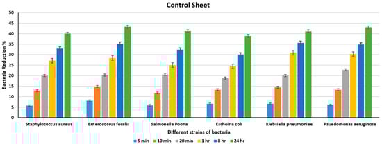 Four sets of antimicrobial polymeric composites, developed using a known composition with the aid of the injection moulding method, were labelled as samples 1, 2, 3, and 4. A commercially available polyethylene sheet was used as a control to evaluate the antimicrobial effectiveness of the developed metal–PLA composites. Antimicrobial efficiency was evaluated over different intervals of time, 5 min, 10 min, 20 min, 1 h, 8 h, and 24 h, against various strains of Gram-positive and Gram-negative bacteria (Escherichia coli, Staphylococcus aureus, Pseudomonas aeruginosa, Klebsiella pneumoniae, Salmonella Poona, and Enterococcus faecalis). Table 3 and Figure 8 display the bacterial counts of different strains on the control sheet after various time intervals.
