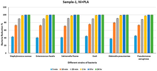 Shows the reduction in the total amount of bacterial percentage for the Ni+PLA sheet at different intervals of time for various bacteria.