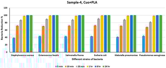 From Table 6 and Figure 11, we observe a substantial reduction in bacterial counts within 20 min for all bacterial strains upon exposure to Cu+PLA. From Figure 11 we can see that there is only approximately 74% reduction in all the different strains of bacteria in 10 min, an approximate reduction of 90% of the bacteria in 20 min, and near-destruction of the bacteria, that is, more than 98% reduction, for all the different strains at the end of 1 h when exposed to Cu+PLA, showing the high antimicrobial efficacy of Cu ions in Cu+PLA composites. The antimicrobial properties of Cu nanoparticles are responsible for reducing the bacterial count due to the antimicrobial activities of the Cu ions, which lead to bacterial cell death. The release of Cu ions is fast initially and then decreases, leading to the prolonged antimicrobial efficacy of these metal nanoparticles over several days [65]. From Figure 11, we can see a significant reduction in the bacterial count from 5 min to 10 min, compared to the interval from 10 min to 1 h or between subsequent intervals. Table 7 shows the count of different bacteria for the CuO+PLA sheet for various time periods, and Figure 12 shows the percentage reduction in the bacterial count at the end of varying intervals for the CuO+PLA sheet.