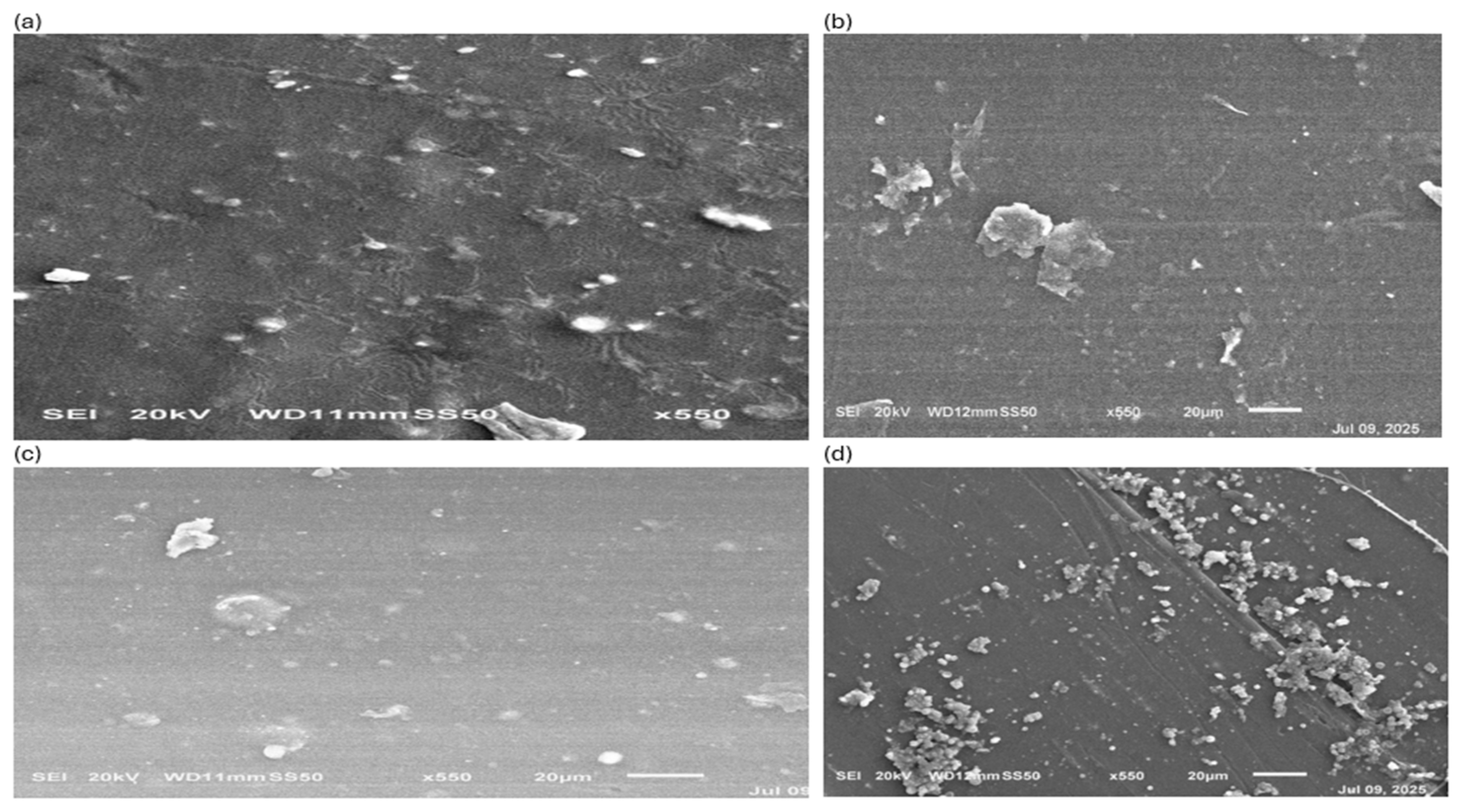 - SEM: The morphological observations define the importance of metal type and chemical nature in the dispersion behaviour in PLA. The surfaces of Ni+PLA and Ag+PLA are smoother and contain fewer visible particulates, and this implies that they are weaker in interfacial compatibility with particles that exist at the bottom of the surface rather than uniformly on the surface. Cu+PLA had moderate dispersion, which showed partial compatibility and agglomeration on small scales. CuO+PLA exhibited a high level of clustering and surface coverage, indicating an increase in the affinity of copper oxide with the PLA matrix. The surface features are essential, as the more irregular and uneven morphologies are related to better bioreactivity and possible antimicrobial effectiveness. Likewise, it has been found that oxide nanoparticles have a greater surface contact with PLA than metallic ones, which increases surface roughness and operational performance [69,70].