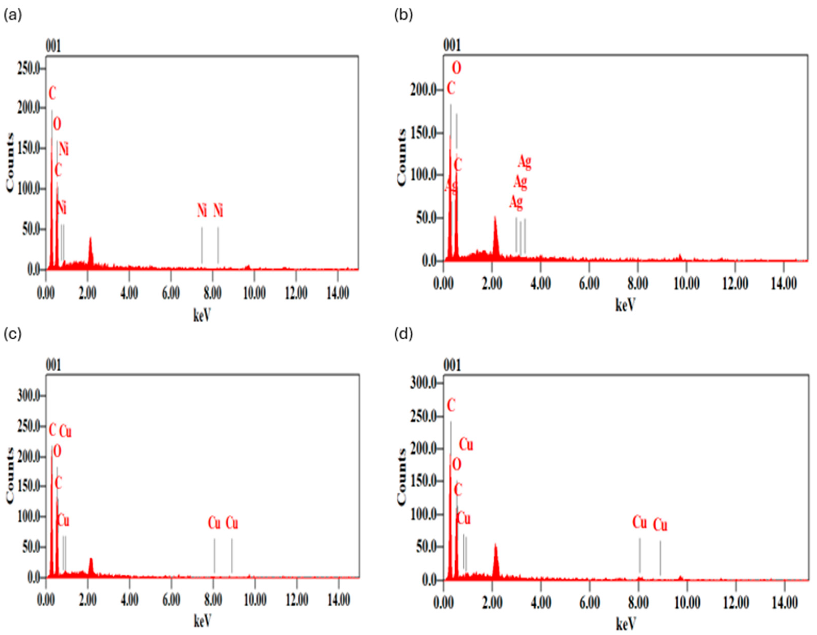 - EDS: The EDS analysis shows different degrees of metal presence in the composites, which are consistent with the morphologies on the surface. Ni+PLA displayed a low Ni Kα signal and 0.83 mass% Ni as an indication of the low surface sensitivity and retention of nickel in the PLA, which is comparable to the low particulates of SEM. Ag+PlA had the lowest incorporation rate (0.05 mass percentage) and had a trace Ag Lα peak, which further supports the SEM result of a predominantly smooth surface with few deposits. The incorporation of Cu+PLA was slightly higher (0.11 mass) with a faint Cu Kα signal, which confirms the presence of scattered protrusions found in SEM micrographs. Comparatively, CuO–PLA exhibited the strongest Cu Kα peak and highest incorporation (1.97 mass%), which is directly correlated to the highly roughened cluster-rich morphology observed in SEM. The results indicate that the oxide form of copper is not only easier to incorporate into PLA, but it is also more surface-active than its metallic equivalent. The same past research has already found that oxide nanoparticles exhibit more interfacial relationships with polymer matrices and also have a higher surface expression than elemental metals [67]. The findings of SEM and EDS correlate with these results. Combined, SEM and EDS offer complementary systems of metal incorporation and distribution in PLA composites. The Ni+PLA and Ag+PLA composites have smooth morphologies, thus leading to weak or trace EDS signals, whereas the Cu+PLA and the CuO+PLA have rougher surfaces and stronger metal peaks, respectively. Significantly, the high level of Cu Ka in CuO+PLA is a quantitative verification of the presence of dense surface agglomerates in SEM, and the fact that Ni and Ag are embedded in the sub-surface is why they are less visible on the surface. The combination of these two methods, therefore, gives a consistent image of the role of metal type and oxidation state on the structural integration of nanoparticles, as well as the surface accessibility of nanoparticles in PLA [69,70].