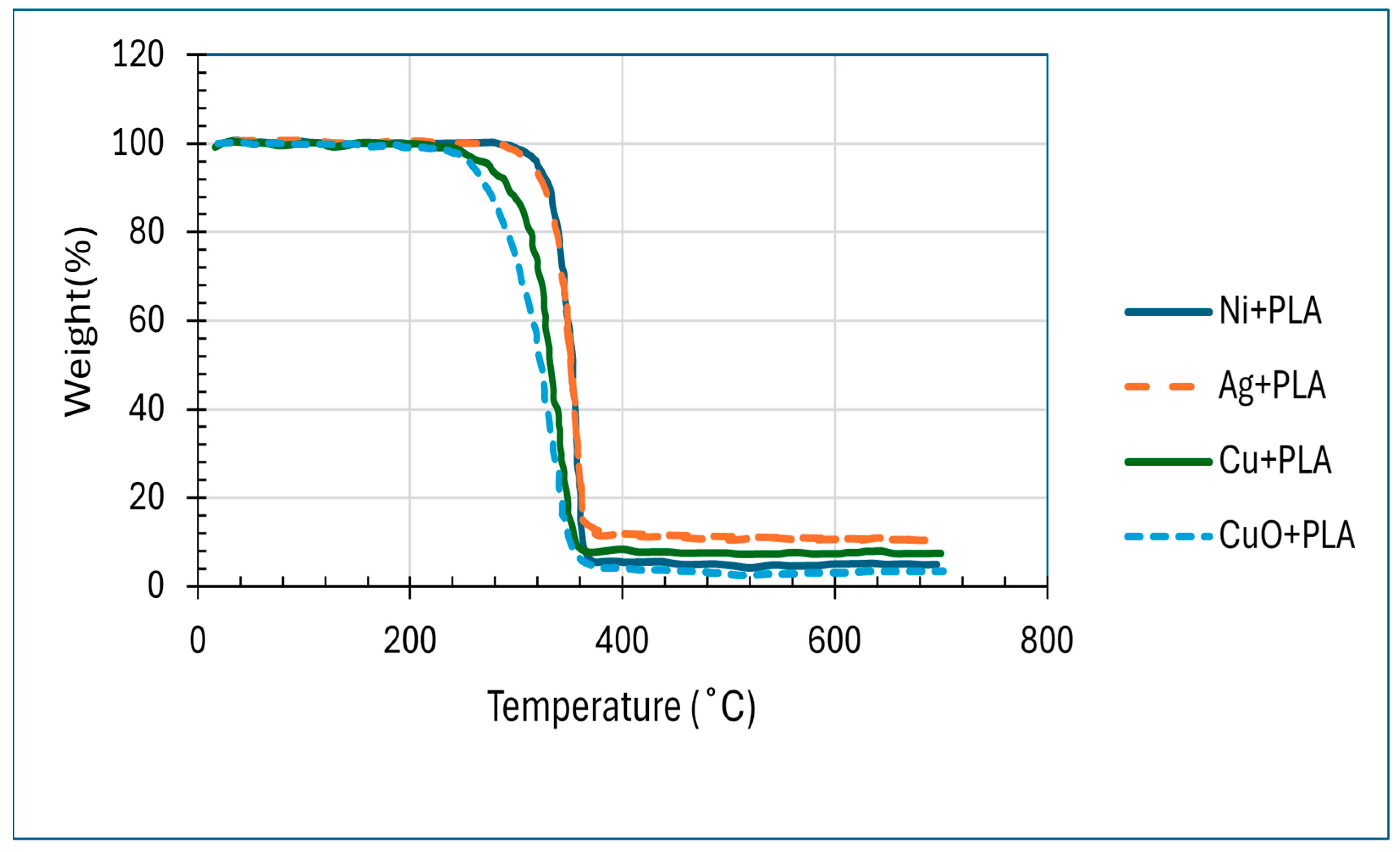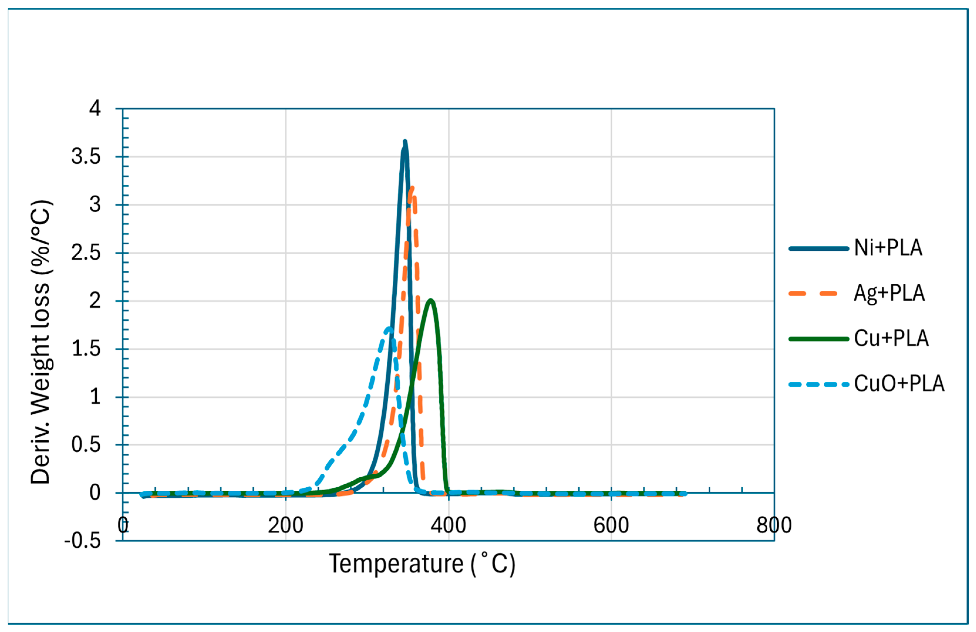 - TGA: From Figure 5 and Figure 6, we observed that the improvement in degradation temperature observed over pure PLA had been confirmed to be because of nanoparticle incorporation, which enhances thermal stability of the composites [72]. This is due to the barrier effect of nanoparticles, which blocks the diffusion of volatile degradation products, and high interfacial interactions, which limit chain mobility and raise the energy of activation to decompose [73]. Ni-PLA was by far the most stable composite with the highest retained mass over higher temperatures, implying that it has the best interfacial reinforcement, and the CuO-PLA also showed significant improvement, although with a broader degradation profile, indicating some catalytic effect. Cu-PLA was more resilient to temperature (390 °C), whereas Ag-PLA was better than pure PLA but had a lower degradation initiation than the others, presumably because of less strong polymer filler interactions. On balance, these results indicate that the addition of nanoparticles is an effective method to relocate PLA degradation to higher temperatures, and Ni-PLA and Cu-PLA can be used as the most thermally stable systems, which is why they are especially applicable in high-temperature conditions [72,73].