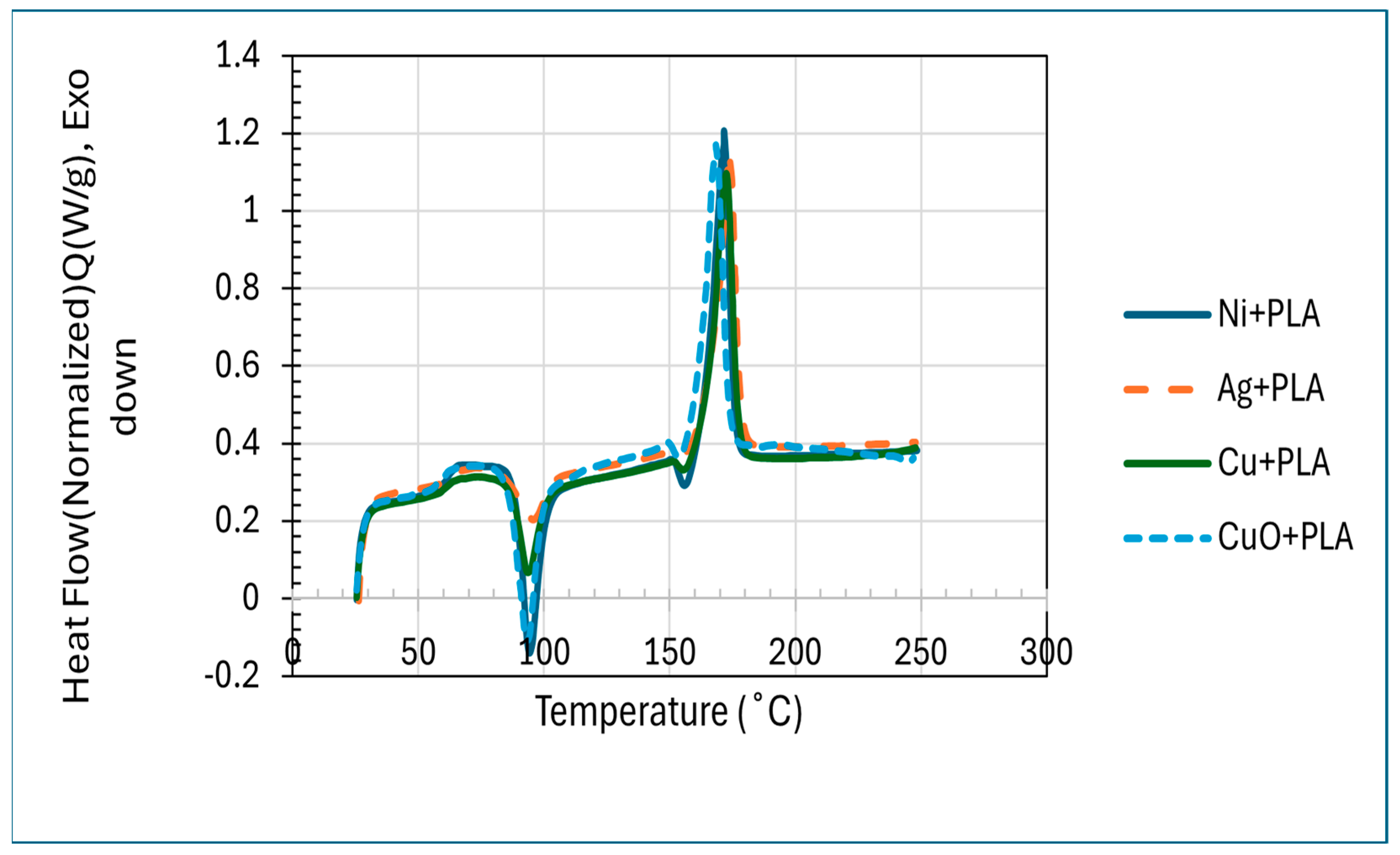 - DSC: The DSC results in Figure 7 show that all the composites had glass transition temperatures near those of neat PLA of about 59.9 °C (Ni+PLA), 60.4 °C (Ag+PLA), 60.6 °C (Cu+PLA), and 58.4 °C (CuO+PLA), meaning that the additives did not have any significant influence on the mobility of the amorphous chain segments. Nevertheless, a clear difference was displayed in crystallisation and melting behaviour. Ni+PLA, with a cold-crystallisation peak of around 93.6 °C (ΔHcc = 22.5 Jg−1) and a melting enthalpy of 35.7 Cg−1, demonstrated the lowest crystallinity (approximately 14 per cent), indicating a reduced nucleation strength of nickel, although it had comparable thermal transitions to pure PLA. Ag+PLA, on the other hand, exhibited a cold-crystallisation peak of approximately 95.0 °C (ΔHcc = 8.8 J g−1) and a melting enthalpy of 41.0 J g−1, which then gave the highest crystallinity (~35%). The large difference between the melting enthalpy and cold crystallisation is evidence of the fact that silver greatly contributed to the nucleation and allowed the formation of stable crystalline structures before heating, which is in agreement with previous studies that the nucleation barrier is reduced by Ag nanoparticles and promotes the formation of stable crystalline domains [74,75]. To cold-crystallise, Cu+PLA showed an eluent peak at approximately 93.4 °C (ΔHcc = 12.4 J g−1) and a melting enthalpy of 37.5 J g−1, which is related to a moderate level of crystallinity (approximately 27 percent), and a large fraction of crystal domains were formed during heating, consistent with reports [70,75] that copper-based additives enhance PLA ordering to a lesser extent than silver. CuO+PLA, where the cold-crystallisation peak was of the order of 93.0 °C (−ΔHcc = 22.5 J g−1) and the melting enthalpy was 37.8 J g−1, attained a crystallinity level of about 16%, and this implies that most of its crystalline structure must have been generated upon heating, and the oxide phase was a weaker nucleating agent than the metallic equivalents, in accordance with previous studies demonstrating lower nucleation efficiency of the metal oxides. These results combined suggest that although the additives did not produce any significant effect on Tg, the effect on ΔHcc and ΔHm defined the degree and mode of crystallisation, with silver exhibiting the highest nucleation capacity, copper a moderate impact, and nickel and copper oxide minimal effect. Also, the difference in crystallinity relates to the significance of additive chemistry and phase in guiding the crystallisation pathways in polymers [74,75]. The enhanced performance of the metallic silver and copper over the nickel and copper oxide is an indication that the metallic fillers offer better nucleation sites owing to their surface energy properties and well-developed interfaces with the PLA matrix. This supports the fact that the crystallisation process cannot solely rely on thermal treatment but also on the physicochemical character of the filler, which determines the stability and packing of crystal nuclei developed in the polymer [75,76,77,78].