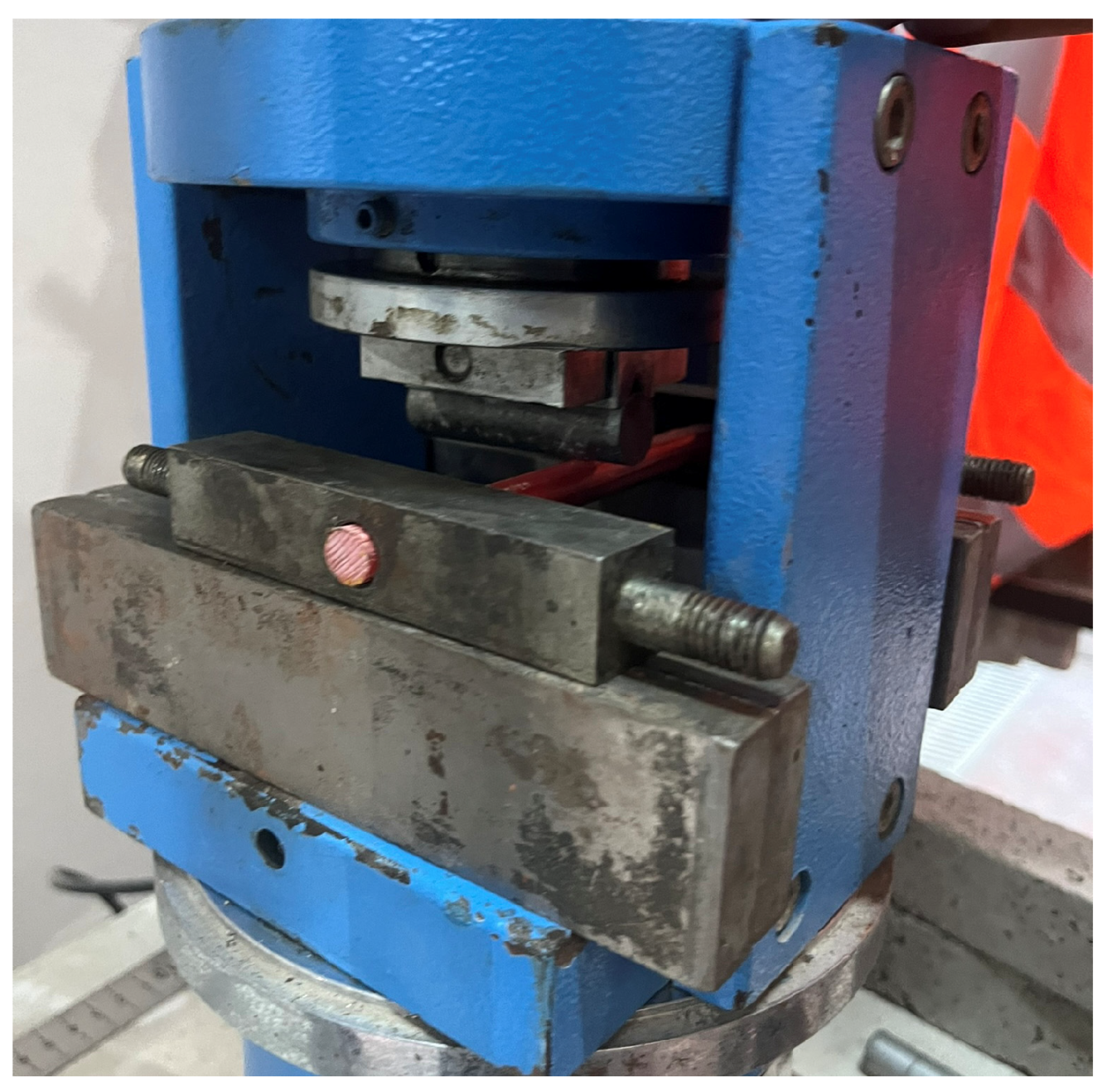 The reinforced concrete beams were experimentally examined using a three-point bending configuration to assess their flexural response under static loading. Each specimen was simply supported over a clear span of 900 mm, and incremental loads were applied at the midspan through a hydraulic testing system. A high-precision displacement transducer positioned at the span center measured vertical deflections, while the applied load was continuously monitored by a calibrated load cell. The beams—measuring 150 mm in width, 200 mm in depth, and 1100 mm in total length—were carefully placed on the test frame to ensure accurate alignment with the supports. A spreader beam was utilized to provide uniform load transfer, thereby replicating realistic flexural loading conditions.