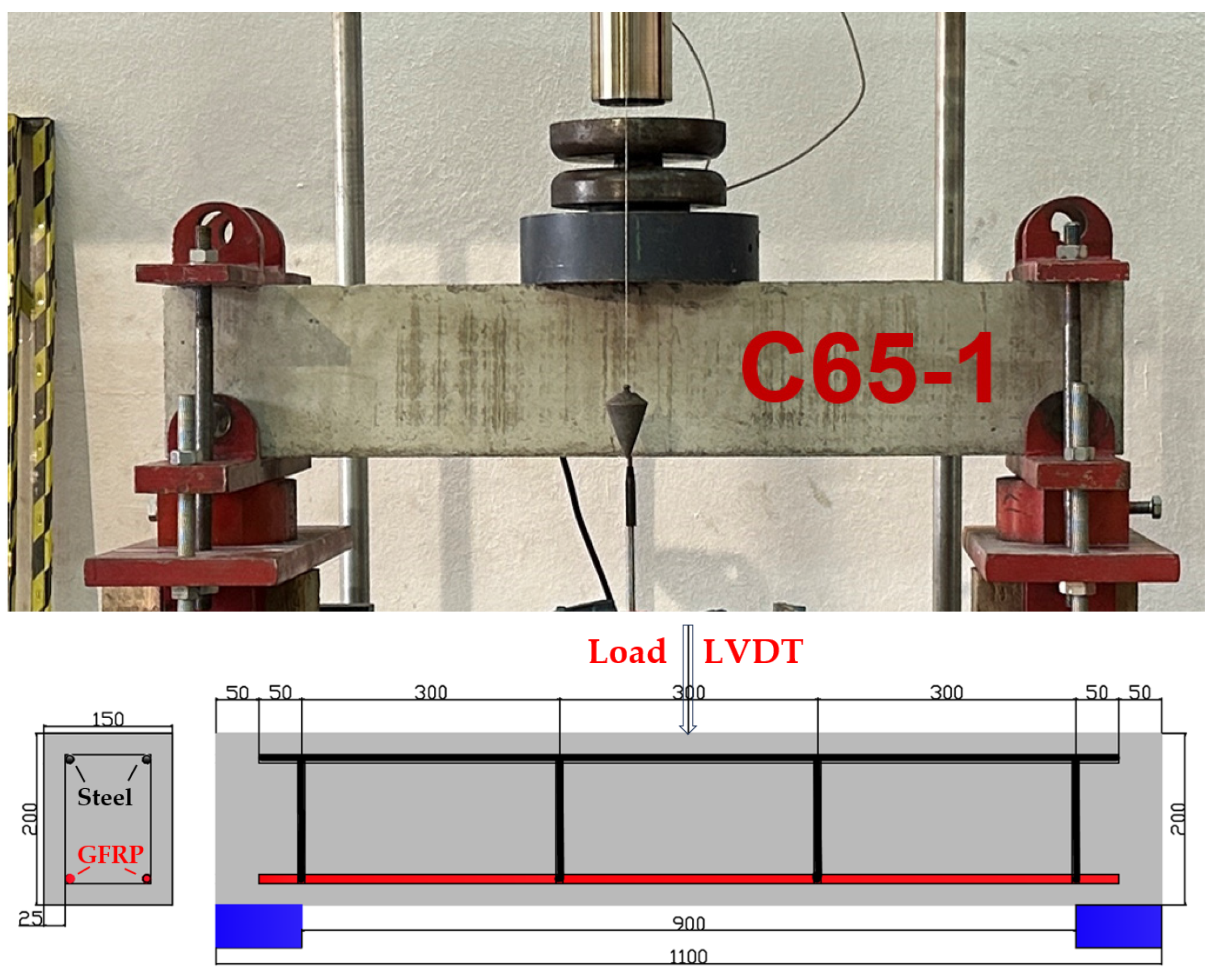 3]. Other investigations have focused on the load–deflection response, failure modes, and crack characteristics of GFRP-reinforced concrete beams, highlighting the influence of concrete strength and reinforcement ratio on flexural performance and crack control [