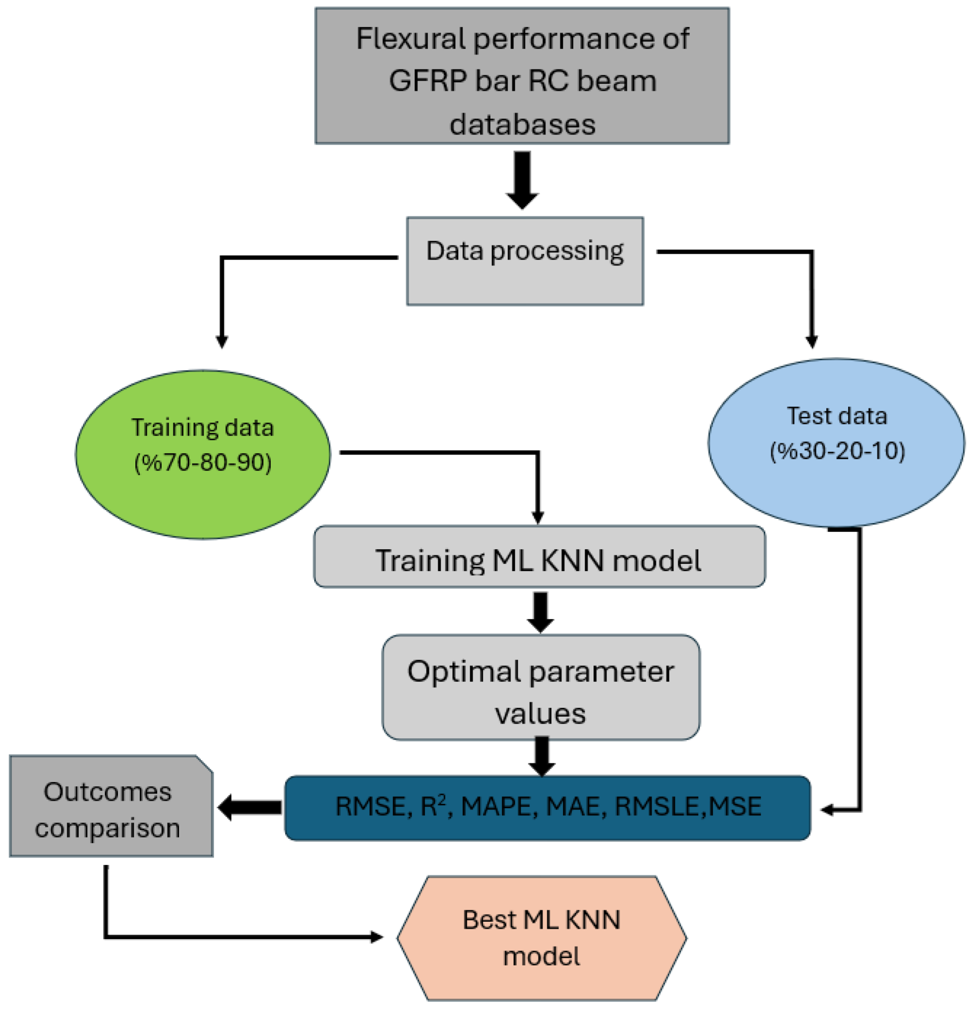 The study investigates a broad spectrum of structural parameters—including various levels of concrete compressive strength, particularly within high-strength concrete classes—as well as GFRP reinforcement materials and changes in beam width, height, effective depth, and reinforcement ratios. In the context of statistical evaluation, a set of widely recognized indicators is utilized to quantify the predictive capability of machine learning models. Among these are the Root Mean Squared Logarithmic Error (RMSLE), Root Mean Square Error (RMSE), Mean Absolute Error (MAE), Mean Squared Error (MSE), the coefficient of determination (R2), and the Mean Absolute Percentage Error (MAPE). Together, these performance metrics provide an impartial assessment of how accurately the regression-based ML model’s estimations correspond to the actual measured values.
