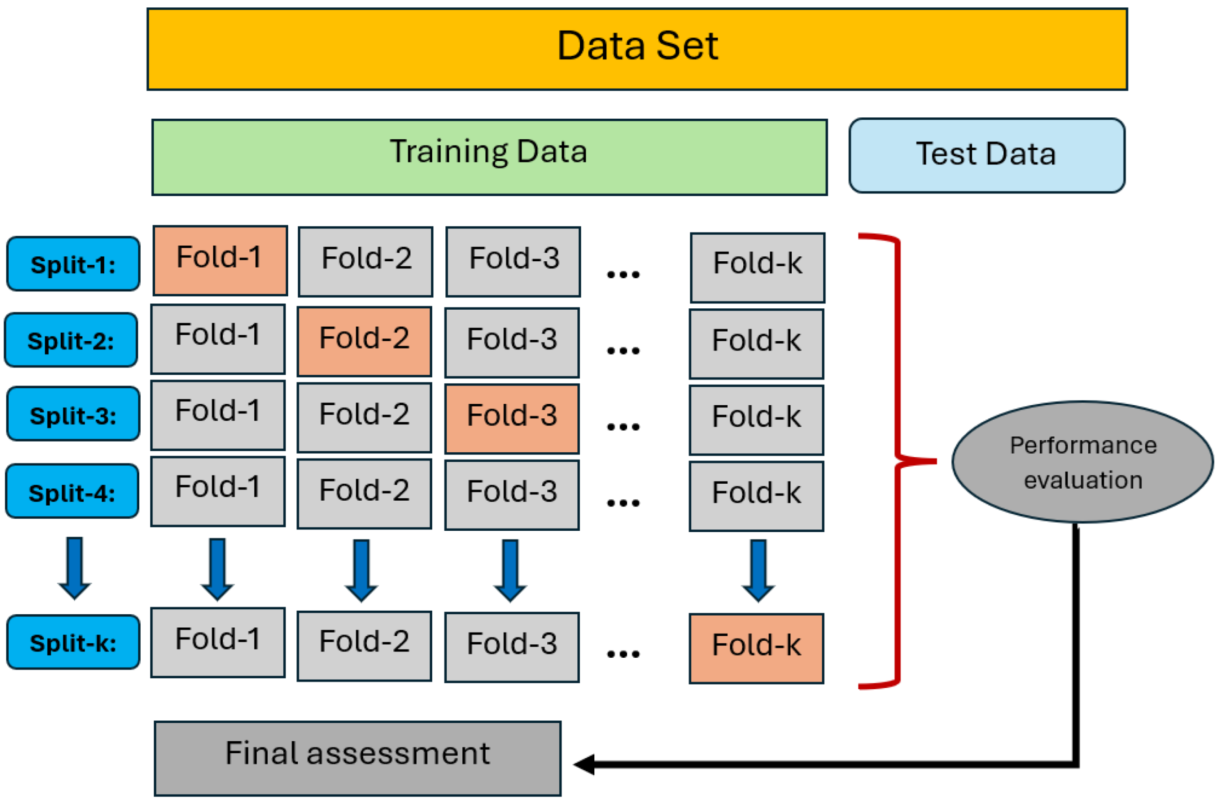 The analysis was conducted following a K = 10 repeated evaluation strategy, whereby the procedure was iteratively repeated. Within each repetition, the data were partitioned according to predefined training–testing ratios (e.g., 80:20). Importantly, model performance was not evaluated based on individual load–deflection points randomly sampled from the entire dataset, but rather on predictions made for beam data not used during the corresponding training phase. This evaluation strategy was applied separately for each beam specimen.