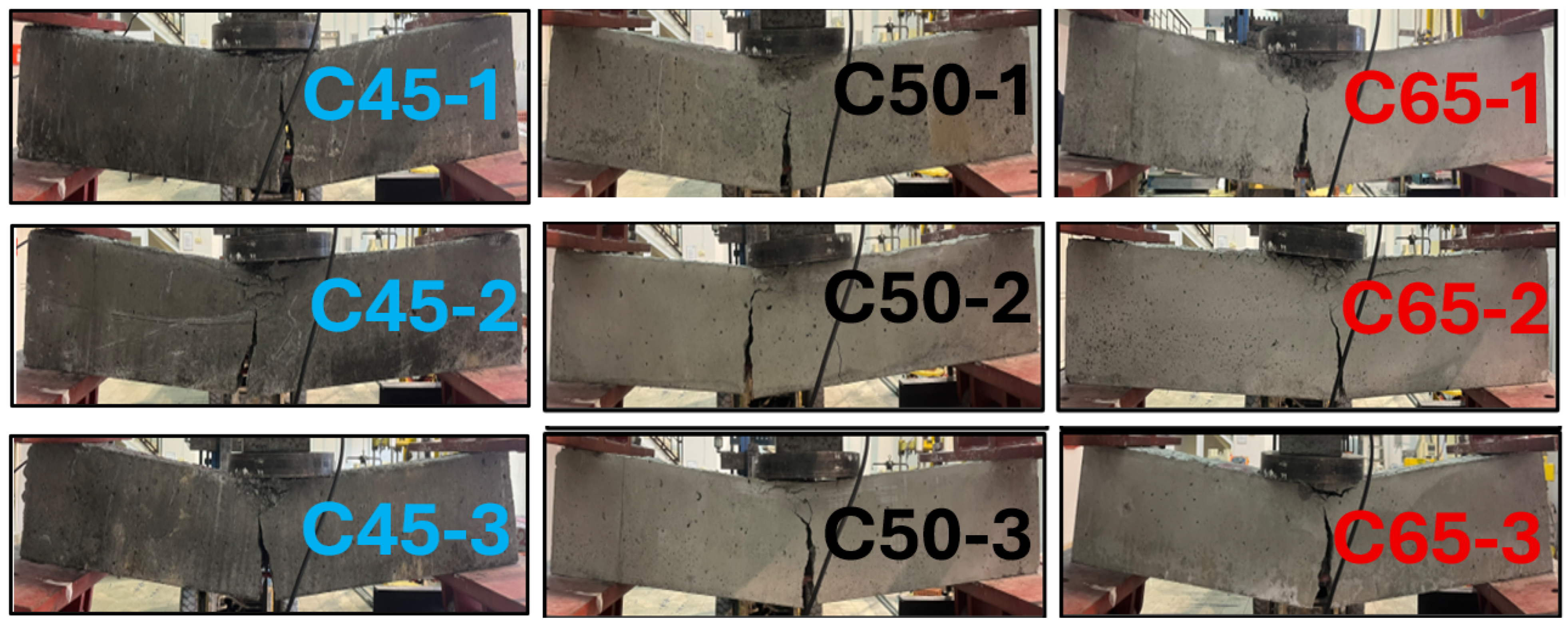 Although the C45 and C50 beam groups, both reinforced with GFRP bars and characterized by higher concrete strengths, exhibited generally similar behavior under the three-point bending tests, the C50 group demonstrated a higher ultimate load-carrying capacity compared to the C45 series. Moreover, both the C45 and C50 groups showed a more ductile response overall when compared with the C65 beams, which possessed the highest concrete strength. Regardless of the concrete strength level, the crack formation pattern and mechanism in all beams were similar, initiating at the mid-span on the tension side and progressing as a wide, dominant flexural crack.