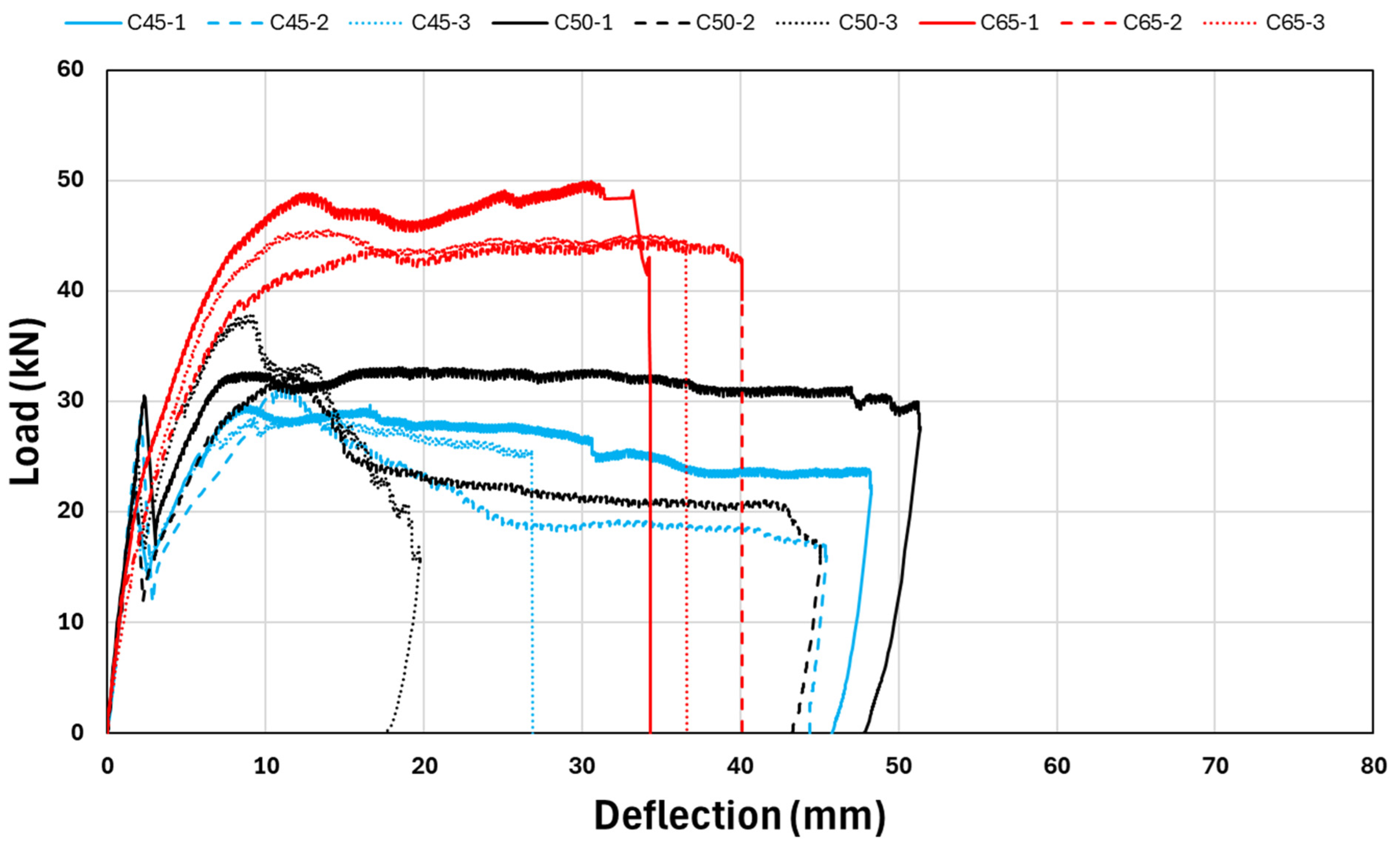Among the C45, C50, and C65 beams, the minimum recorded deflection was approximately 20 mm, whereas the beam exhibiting the maximum deflection exceeded 50 mm.