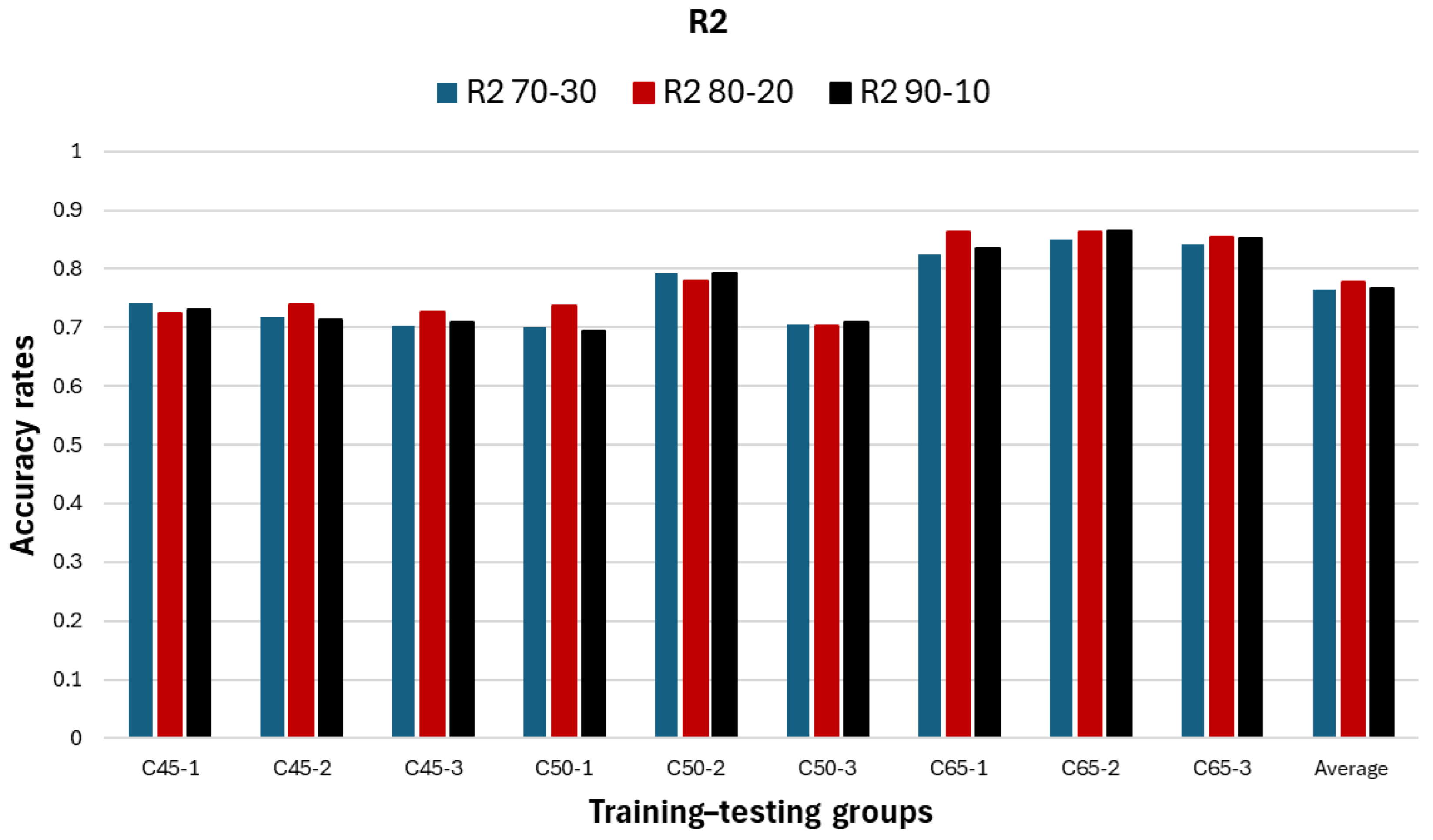 In comparison of the 70:30, 80:20, and 90:10 KNN models, it was observed that the prediction accuracies did not differ significantly among the three, and each model exhibited an average prediction accuracy of approximately 80%. Among them, the 80:20 model demonstrated slightly higher accuracy compared with the others. These findings indicate that, in the deflection prediction analyses of GFRP-reinforced and high-strength concrete beams, the ML-based KNN models provide comparable performance, with the 80:20 configuration offering a marginal advantage.