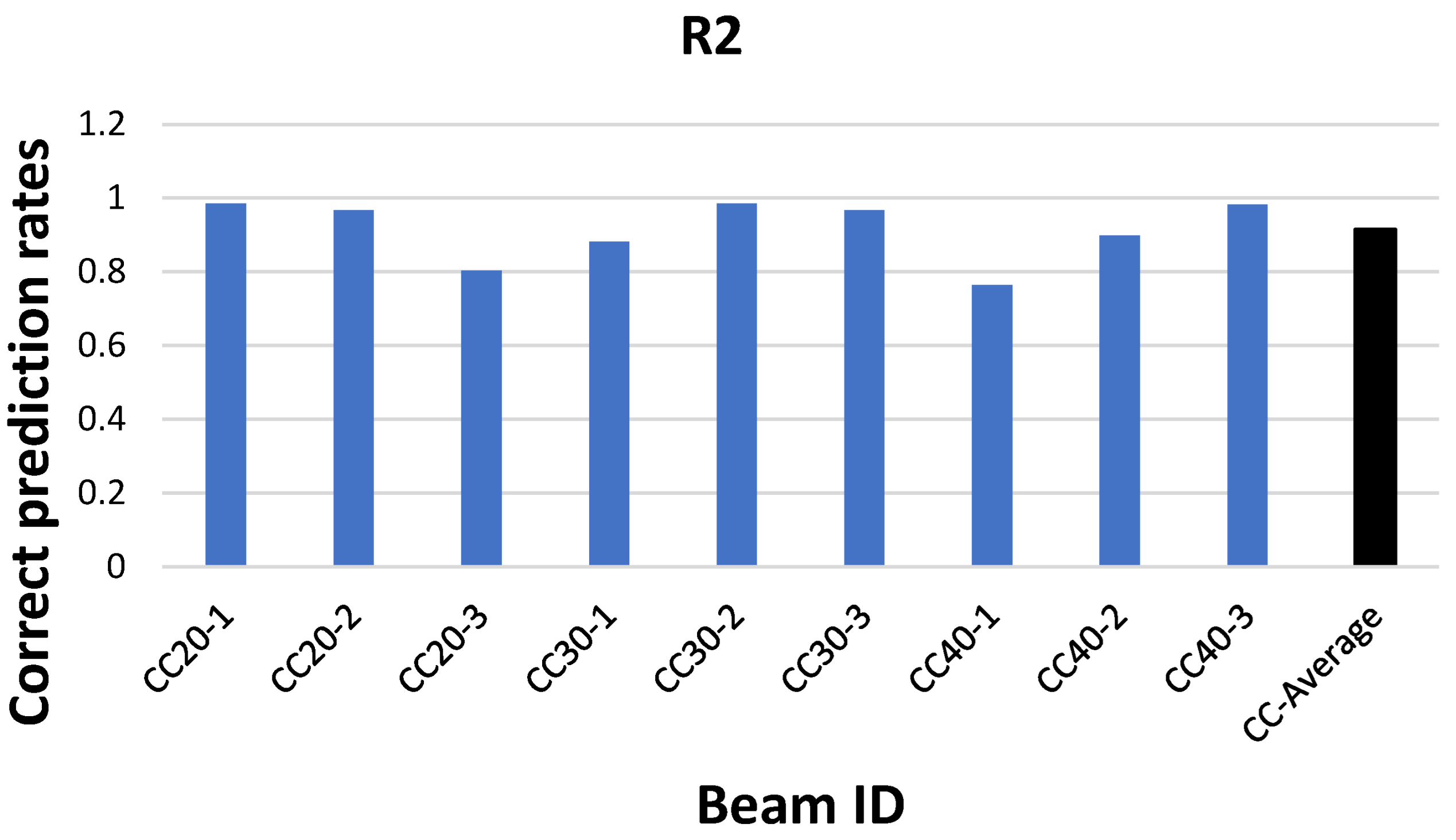 The deflection predictions obtained from the ML-based KNN model for the RC beam group with higher concrete compressive strength (designated as C65) exhibited greater accuracy—approximately 85%—compared with the groups having relatively lower concrete strength.