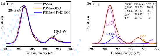 XPS is a powerful way to identify the atomic composition of solid surfaces and characterize their local chemical environment. Therefore, it was utilized to further determine the chemical species on the surface of the PSMA, PSMA-BDO and PSMA-PTMG1000. The high-resolution C 1s XPS spectra and peak fittings are shown in Figure 3a and Figure 3b–d, respectively. The C 1s spectra (Figure 3a) depict two peaks with binding energies (BE) at around 284.8 and 289.1 eV. The peak at around 284.8 eV corresponds to the hydrocarbons (C-H/C-C/C=C) [31,32], and the shoulder peak at around 289.1 eV is related to the carboxylate carbon (COO), which is obviously from the maleic anhydride groups [31,32]. In comparison with the high-resolution C 1s spectrum of pristine PSMA, those of PSMA-BDO and PSMA-PTMG1000 showed a slight increase at 284.8 eV and a decrease at 289.1 eV. This result indicated that the BDO and PTMG1000 have been successfully grafted on the surface of PSMA, which is consistent with the FTIR result. According to the peak-fitting result of C 1s spectrum of pristine PSMA (Figure 3b), there are another two peaks, assigned to C-COO of MA units at 285.7 eV and to π-π* shake-up satellite from aromatic ring of St units at 291.0 eV [32,33]. From the peak-fitting results of C 1s spectra of PSMA-BDO and PSMA-PTMG1000 (Figure 3c,d), a new peak at 286.65 eV, assigned to C-O from PTMG or BDO [34], could be observed. The C-O component accounts for 5.03% of the total carbon content in PSMA-PTMG1000, which is higher than the 4.16% observed for PSMA-BDO. Furthermore, the ratio of C-O to COO peak areas is 0.55 for PSMA-PTMG1000, which is greater than the ratio of 0.40 for PSMA-BDO. These results quantitatively demonstrate that the flexible polyether segments of PTMG are enriched on the surface of PSMA-PTMG1000, whereas short-chain ester linkages are enriched on the surface of PSMA-BDO.