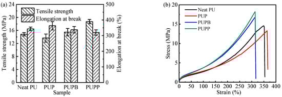 Mechanical properties (a) and stress–strain curves (b) of neat PU, PUP, PUPB and PUPP.