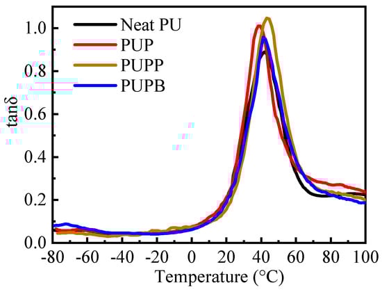 Tanδ vs. temperature for neat PU, PUP, PUPB and PUPP.