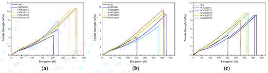 | Composites | E50 (MPa) | E100 (MPa) | E200 (MPa) | E300 (MPa) | Tensile Strength (MPa) | Elongation at Break (%) |