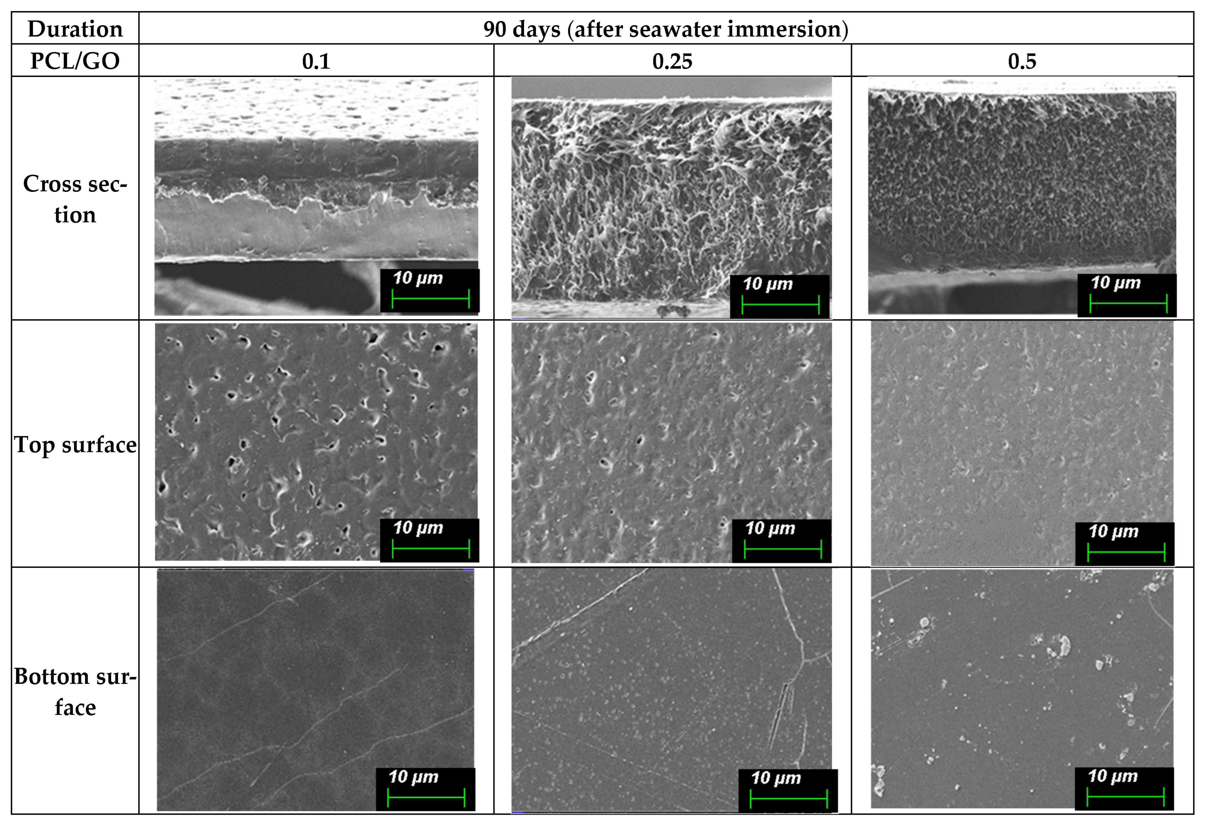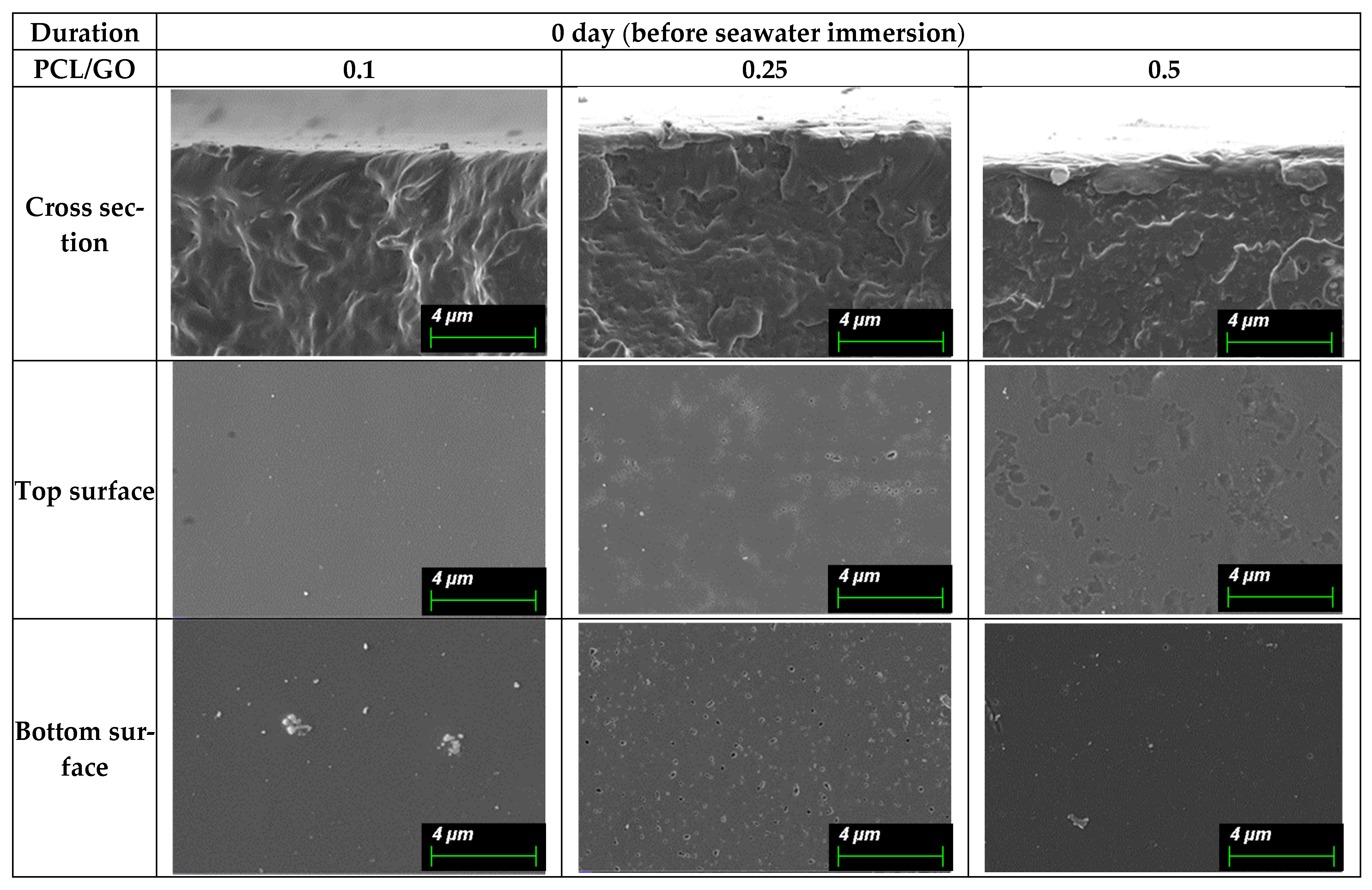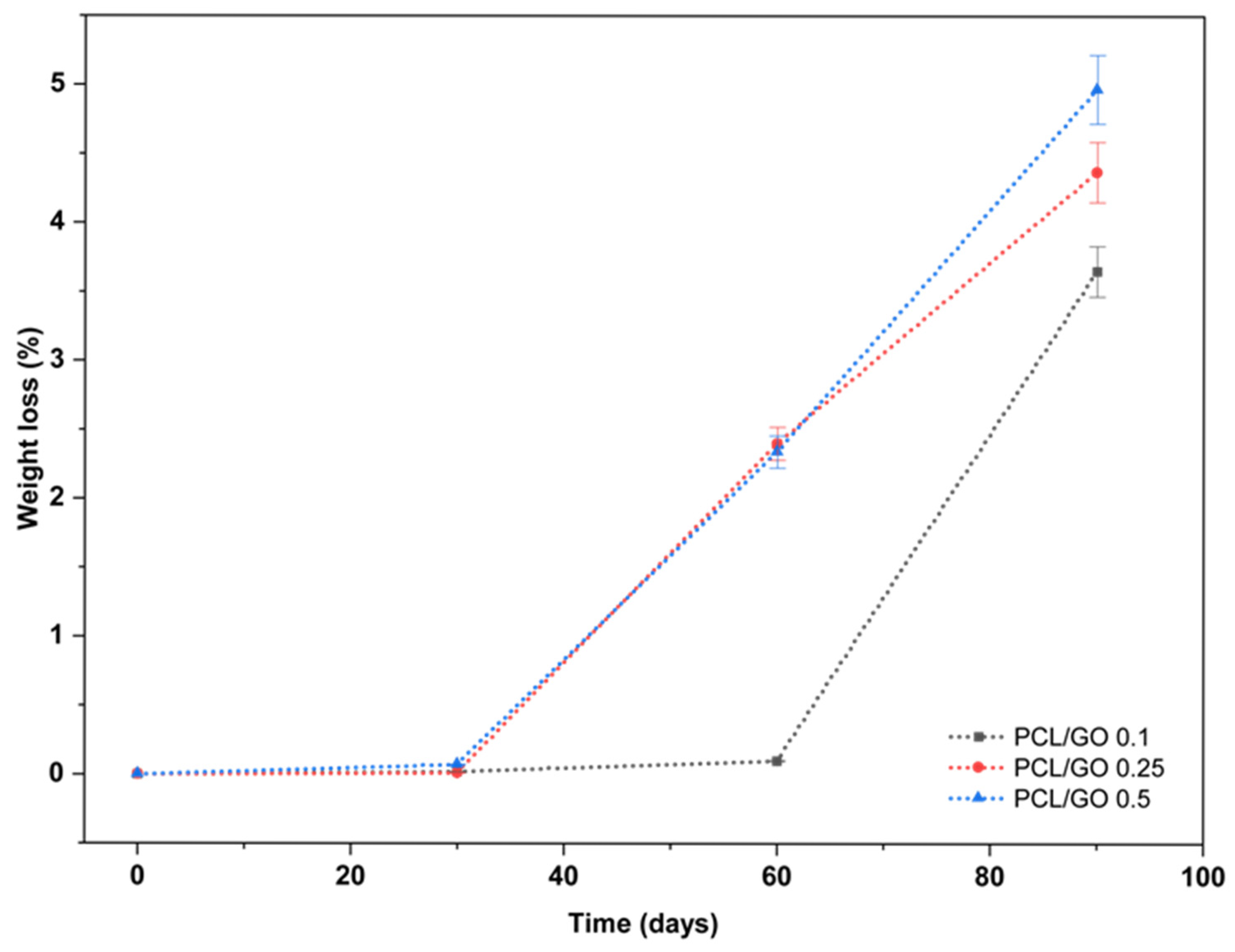 | PCL/GO 0.25 | 0 | 331 ± 18 | 5.7 ± 0.6 |