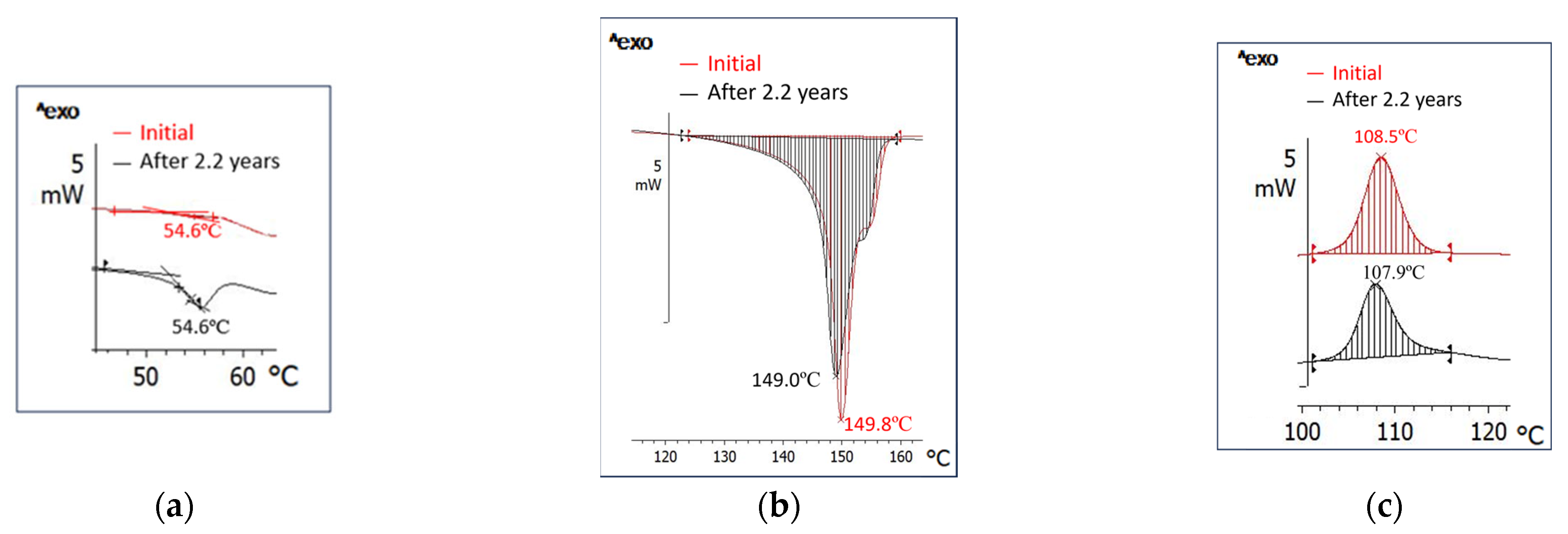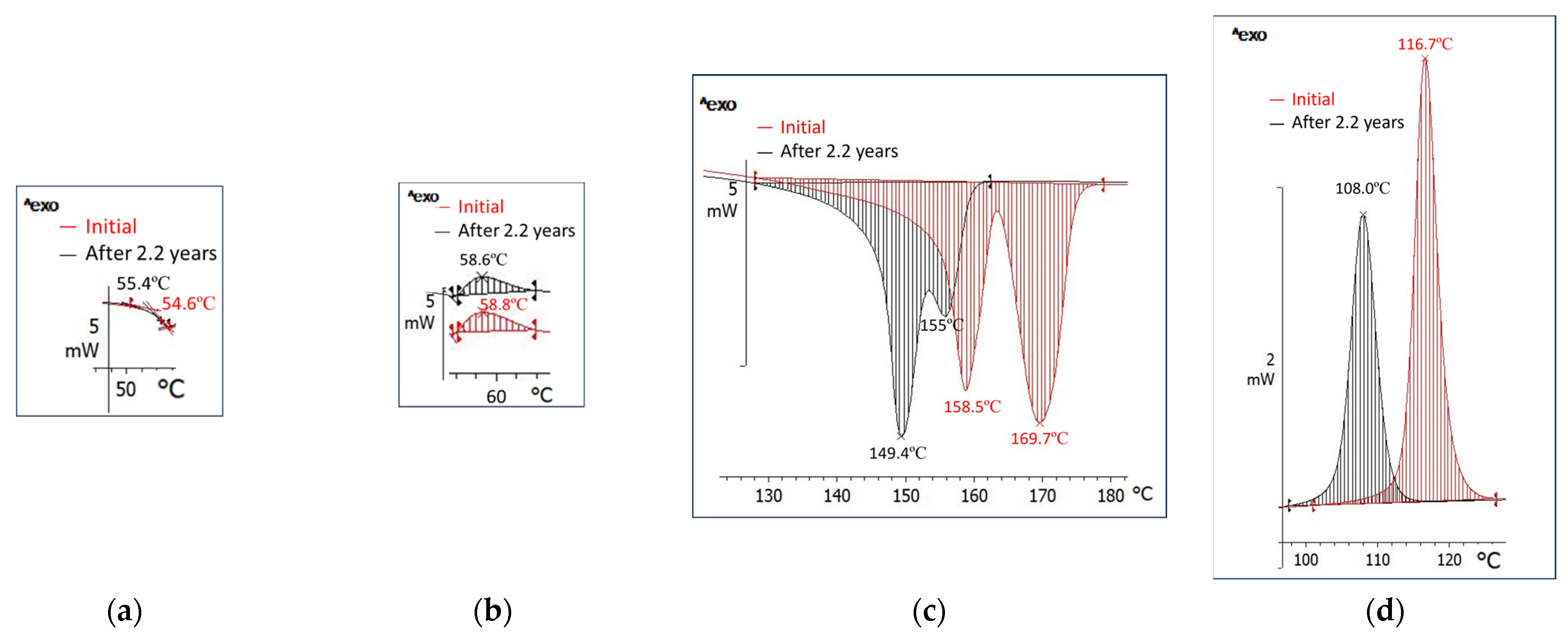 - Skotnicki, M.; Drogoń, A.; Lulek, J.; Pyda, M. Physical ageing of amorphous poly (lactic acid)-indapamide system studied by differential scanning calorimetry. Pharmaceutics 2023, 15, 2341. [Google Scholar] [CrossRef]
