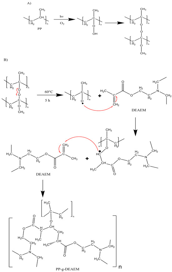 (A) Formation of peroxides by gamma radiation in PP. (B) Grafting reaction for the synthesis of the copolymer.