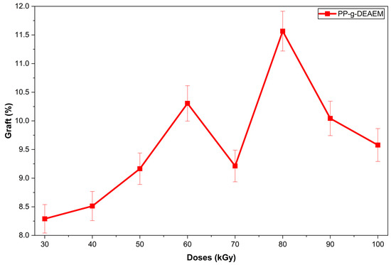 Results of PP-g-DEAEM are shown in Figure 1. Grafting increases with increasing dose, reaching a maximum at 80 kGy. This is attributed to the optimal formation of peroxides at this dose (Figure 1), which react with DEAEM. At doses of 90 kGy or higher (Figure 2), two factors may contribute to a decrease in grafting: (i) the start of PP degradation and excessive peroxide formation in the PP matrix, leading to reactions between them, reducing monomer grafting [32,33,34].