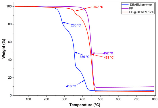 Percentage mass loss as a function of temperature was determined by thermogravimetric analysis (TGA). PP, PP-g-DEAEM films, and the DEAEM polymer (Figure 4) were analyzed. The PP film exhibited a 10% weight loss at 427 °C, a decomposition temperature at 452 °C, attributed to the breaking of C–C bonds along the polymer backbone [38], and a char yield of 9.9% at 800 °C.