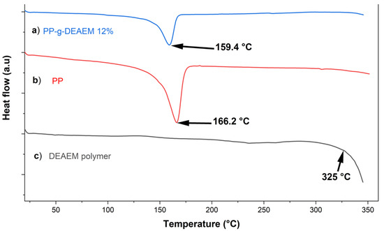 DSC analysis. (a) PP-g-DEAEM 12%. (b) PP. (c) DEAEM polymer.