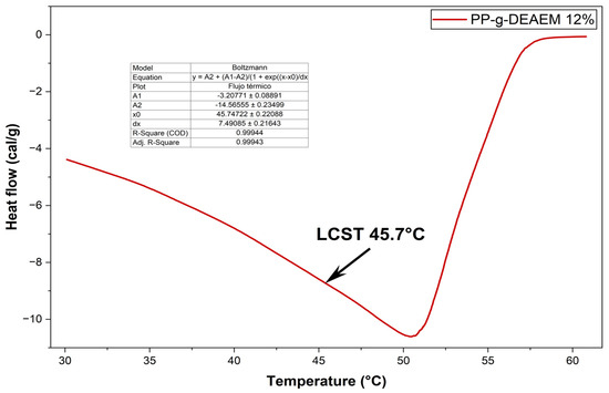 Finally, the swollen PP-g-DEAEM shows an LCST at 45.7 °C (Figure 6). Using the Boltzmann sigmoid function fit allows determining the LCST based on heat flow versus temperature. When the system reaches its LCST, a phase transition occurs within a narrow temperature range (45.7 °C); at this point, it fits as a sigmoidal drop in heat flow. Previous studies have reported values ranging from 14 to 72 °C [41,42]; these differences are due to factors like copolymer composition, molecular weight, solution concentration, and pH [41].