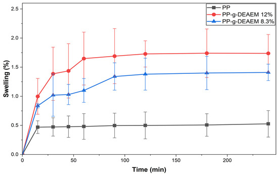 Figure 7 shows the swelling results in distilled water. PP films exhibited almost no swelling (0.5%), as expected due to their hydrophobic nature [43]. In contrast, PP-g-DEAEM reached a maximum swelling of 1.74% and 1.3% for grafts of 12% and 8.3%, respectively, after 2 h, which is attributed to hydrogen bonding between the carbonyl group of DEAEM and water.