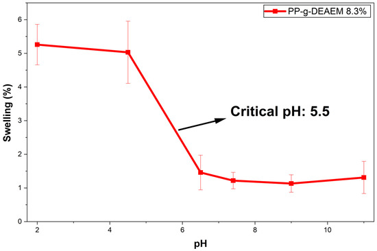 The pH reaction experiment was conducted over a broad pH range (2–11). As shown in Figure 9 and Figure 10. The swelling of PP-g-DEAEM increases at acidic pH due to the protonation of tertiary amines, resulting in a swollen state [47,48,49]. As the pH increases above the critical pH of 5.6, swelling decreases, leading the material to enter a collapsed state, which indicates that it loses the hydrophilicity gained through DEAEM grafting [50]. It is worth noting that the swelling profile of the material with 8.3% grafting closely resembles that of 12%, indicating that, within this range, the degree of grafting does not significantly affect the response to pH.