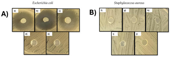 Only S. aureus and E. coli were selected for microbiological tests because these two species are widely recognized as representative models of Gram-positive and Gram-negative bacteria, respectively. In addition to confirming that ciprofloxacin was loaded, the objective was to detect inhibition halos.