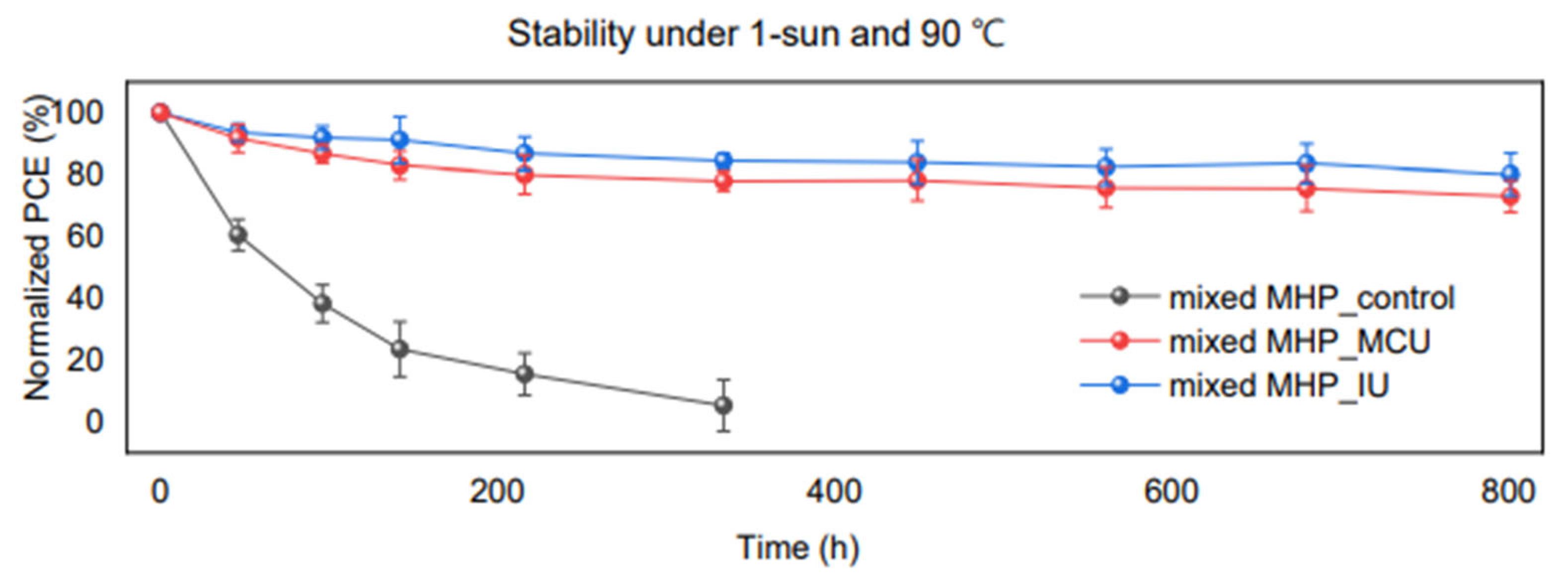 - Chen, J.; Li, J.; Wang, T.; Yuan, Q.; Shi, X.; Li, X.; Jiang, B. Enhancing the stability of air-processed perovskite solar cells through a self-healing polymer with dynamic molecular locks for grain boundary engineering. J. Mater. Chem. A 2025, 13, 16171–16181. [Google Scholar] [CrossRef]