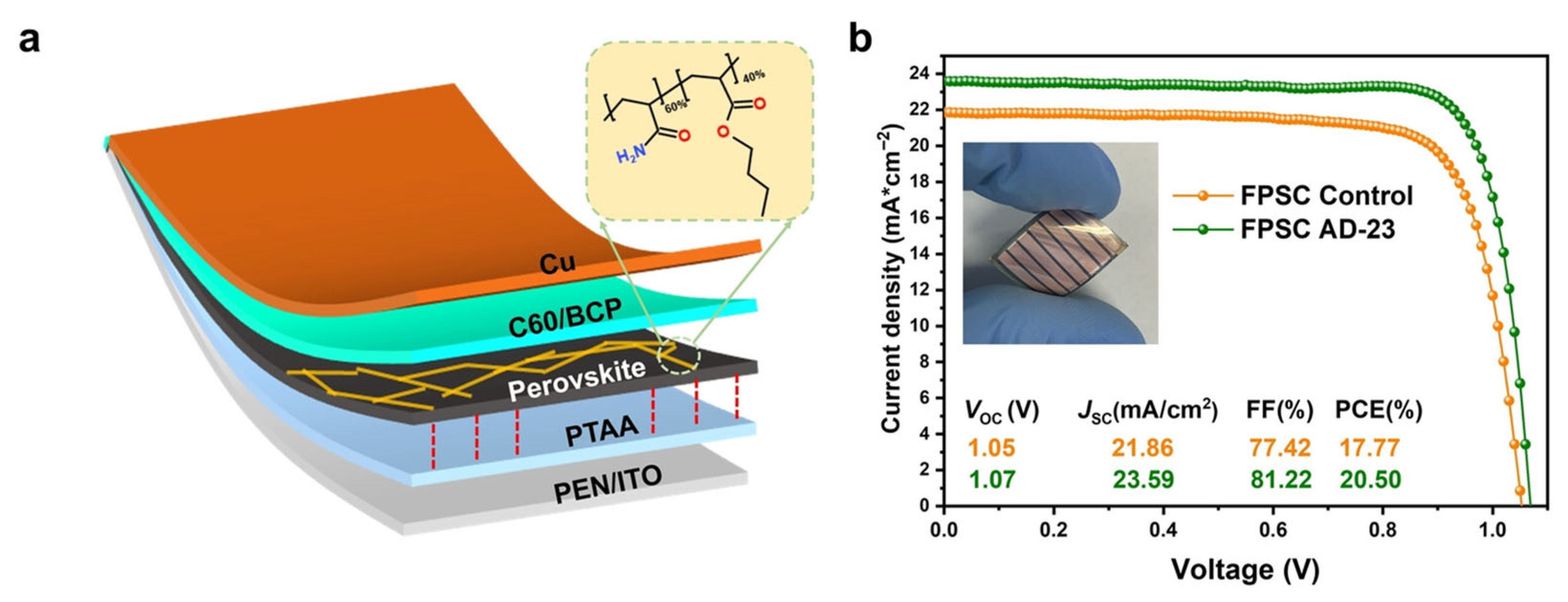 - Ning, L.; Song, L.; Wen, X.; Gu, N.; Du, P.; Yu, J.; Xiong, J. Enhanced molecular interaction by polymer additive for efficient and stable flexible perovskite solar cells. J. Mater. Sci. 2022, 57, 20654–20671. [Google Scholar] [CrossRef]