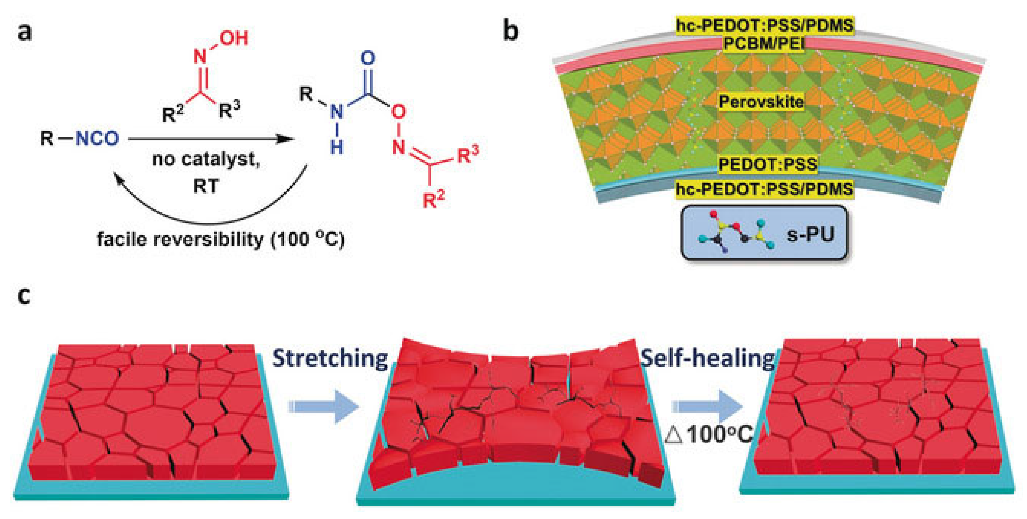 - Xu, P.; Liu, J.; Wang, S.; Chen, J.; Han, B.; Meng, Y.; Yang, S.; Xie, L.; Yang, M.; Jia, R.; et al. Dynamic covalent polymer engineering for stable and self-healing perovskite solar cells. Mater. Horiz. 2023, 10, 5223–5234. [Google Scholar] [CrossRef] [PubMed]
